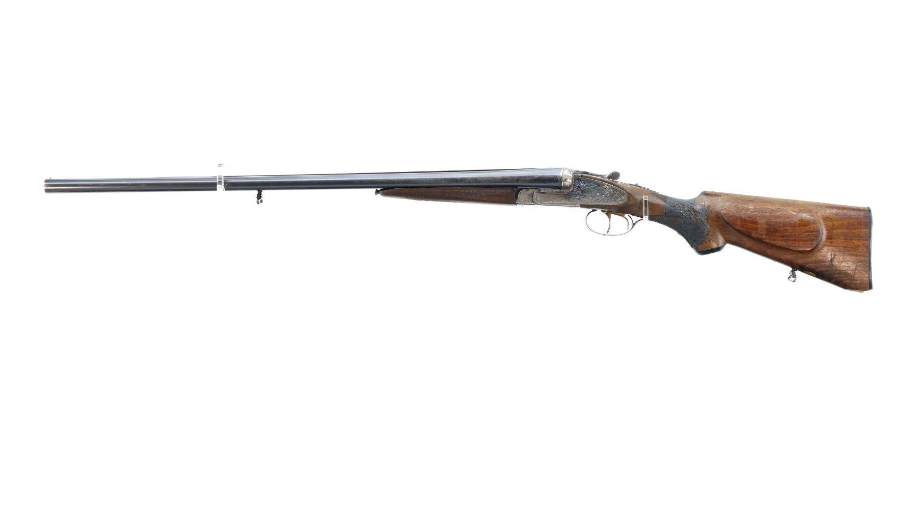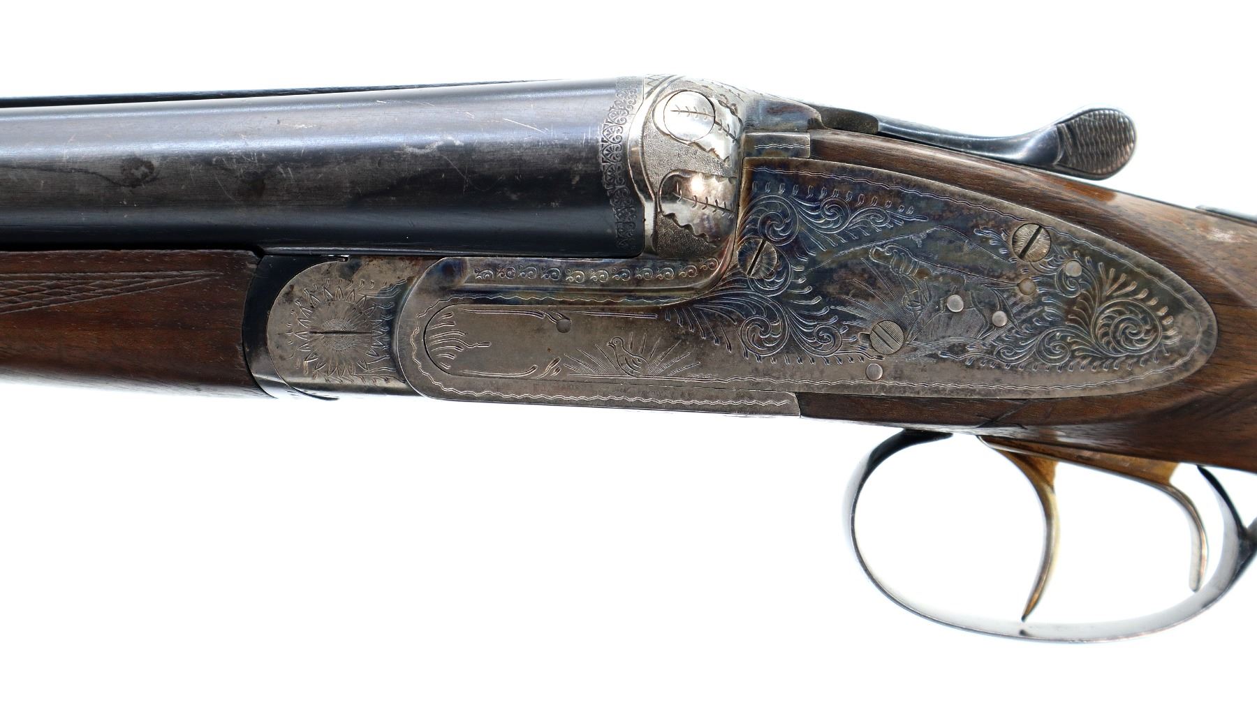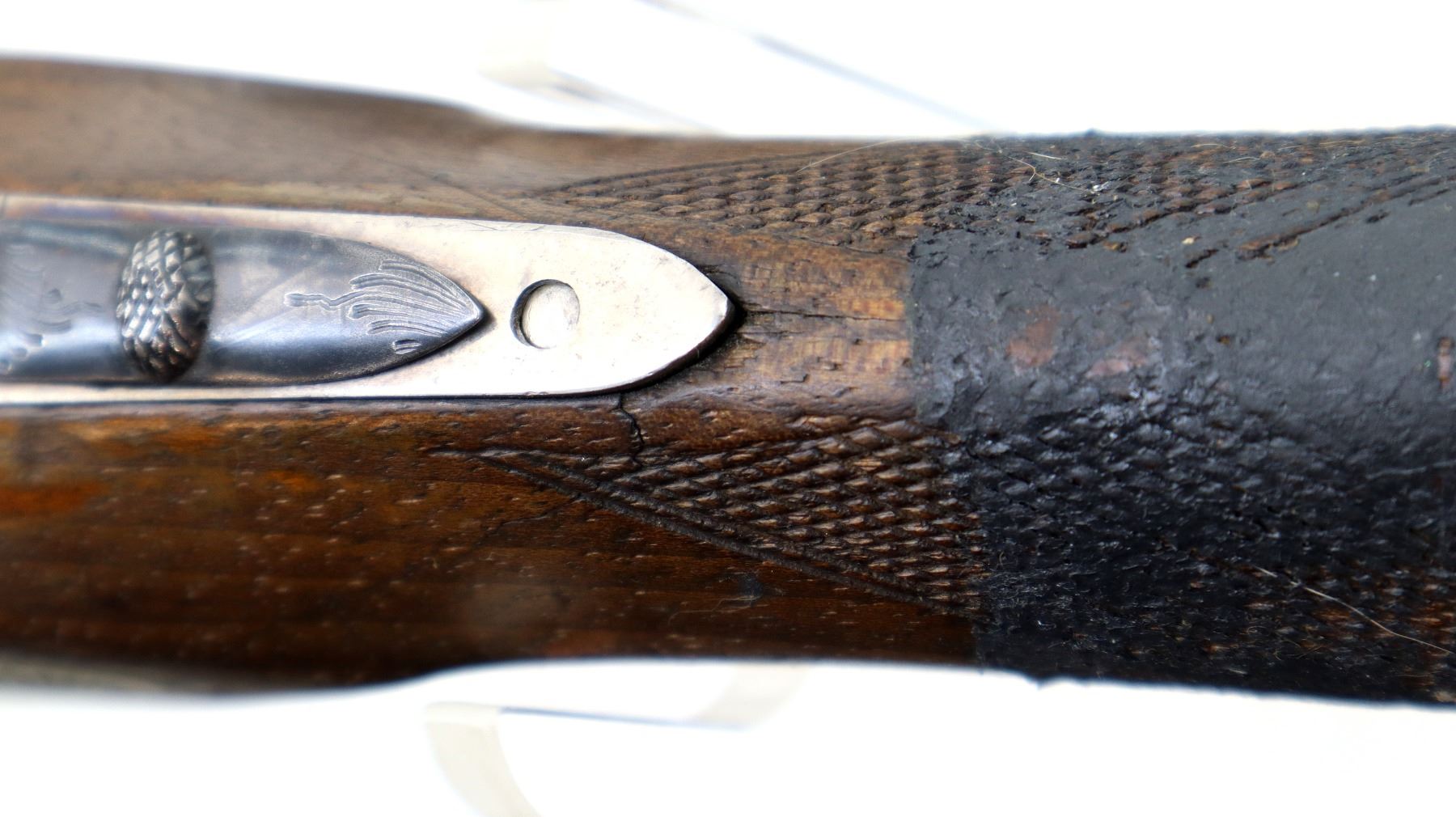 Main Description: Brass bead, blued barrels with raised rib, engraved colour case hardened receiver and side locks, automatic safety, extractor, double triggers. Two piece wood stocks, checkered forearm and pistol grip, stock cracked chipped and repaired through wrist with black epoxy, cheek rest, grooved black polymer butt plate, both stock and plate broken at toe, vanity plate, grip cap, sling swivels.
