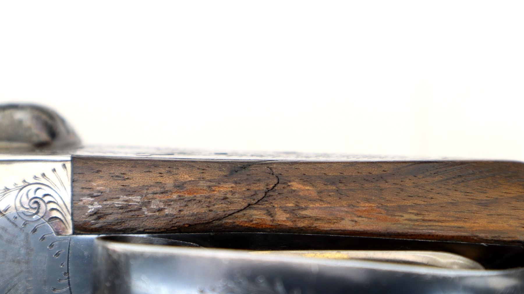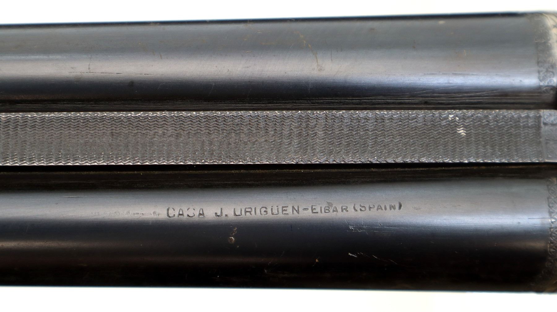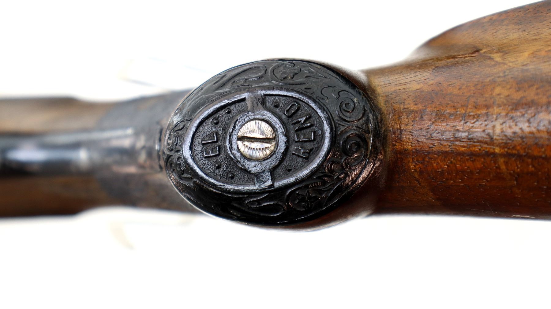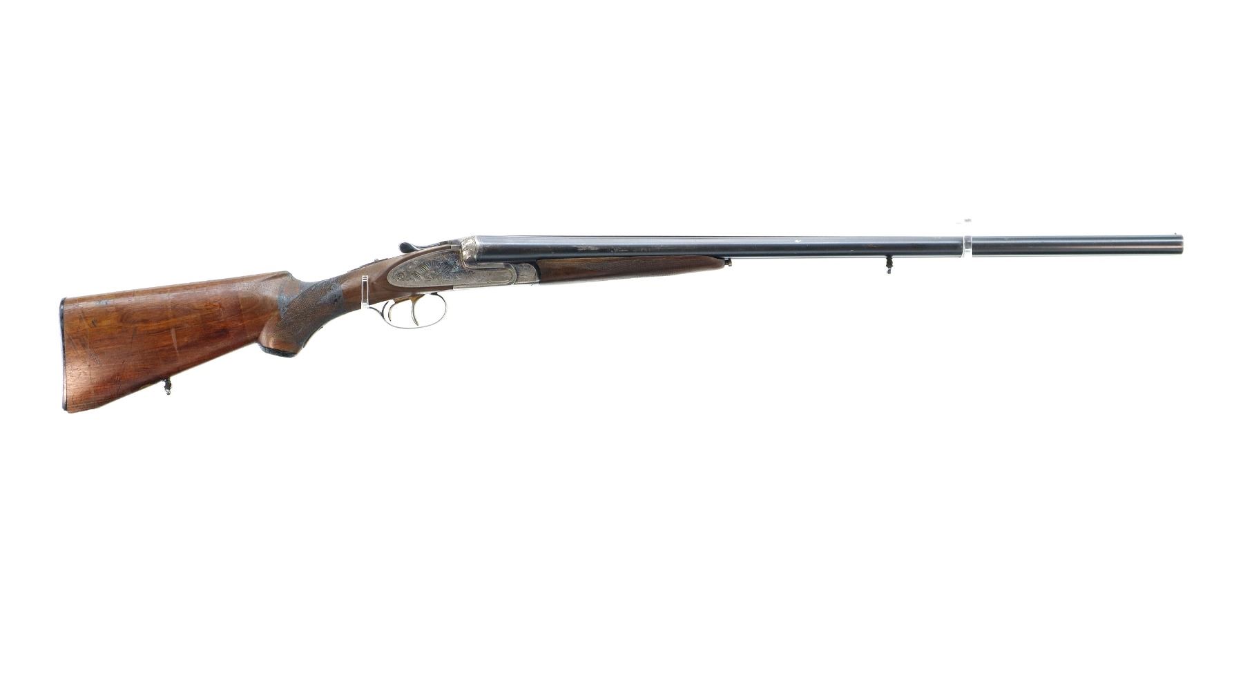 Main Description: Brass bead, blued barrels with raised rib, engraved colour case hardened receiver and side locks, automatic safety, extractor, double triggers. Two piece wood stocks, checkered forearm and pistol grip, stock cracked chipped and repaired through wrist with black epoxy, cheek rest, grooved black polymer butt plate, both stock and plate broken at toe, vanity plate, grip cap, sling swivels.