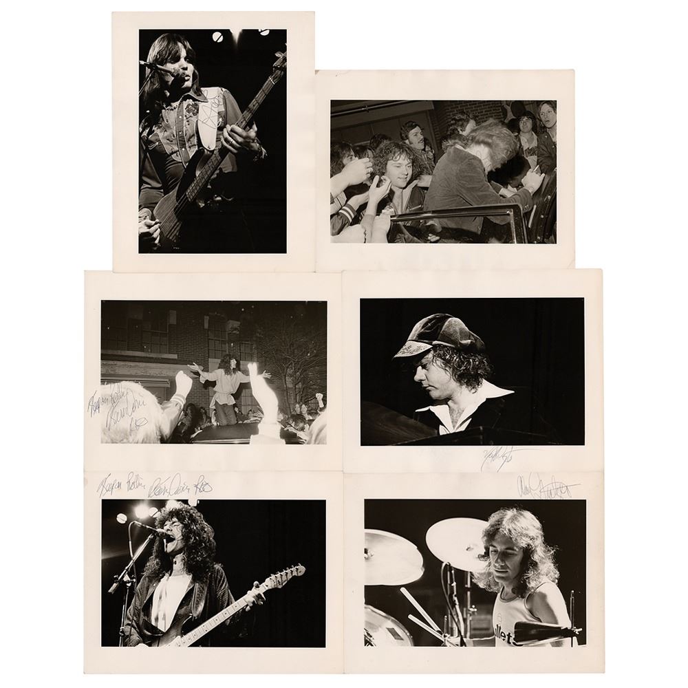 Excellent group lot of six vintage semi-glossy 14 x 11 silver gelatin photos of REO Speedwagon, showing band members during and following a concert from the late 1970s / early 1980s, each individually signed in black ballpoint by a musician: Kevin Cronin (2), who adds “Keep on Rollin” and “REO” to both, Bruce Hall (2), Neal Doughty, and Alan Gratzer. In overall fine condition, with light rippling and creasing to edges.