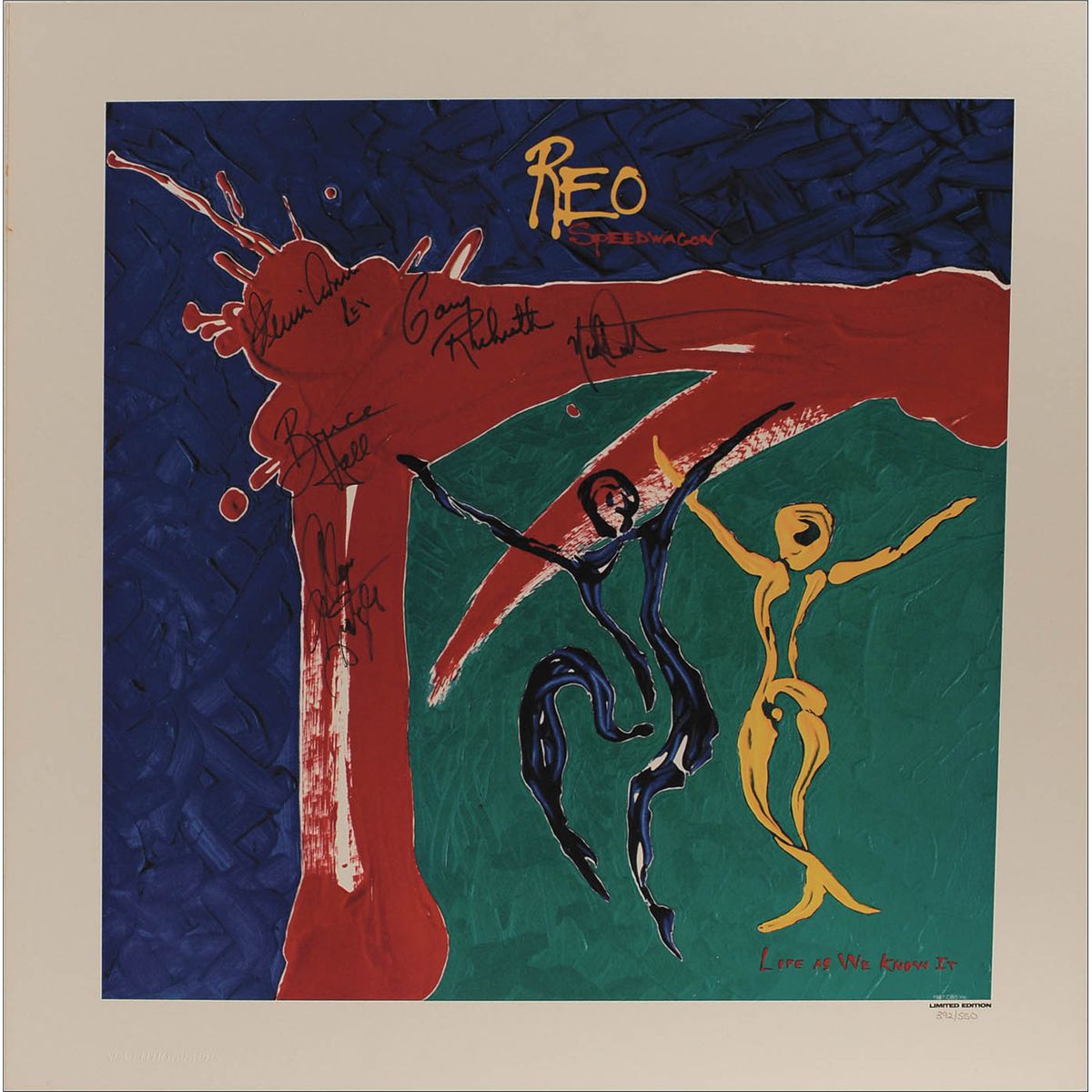 Color limited edition 22 x 22 cardstock print of the Life As We Know It album cover, numbered #392/550, signed in black felt tip by Kevin Cronin, Gary Richrath, Neal Doughty, Alan Gratzer, and Bruce Hall. In fine condition.
