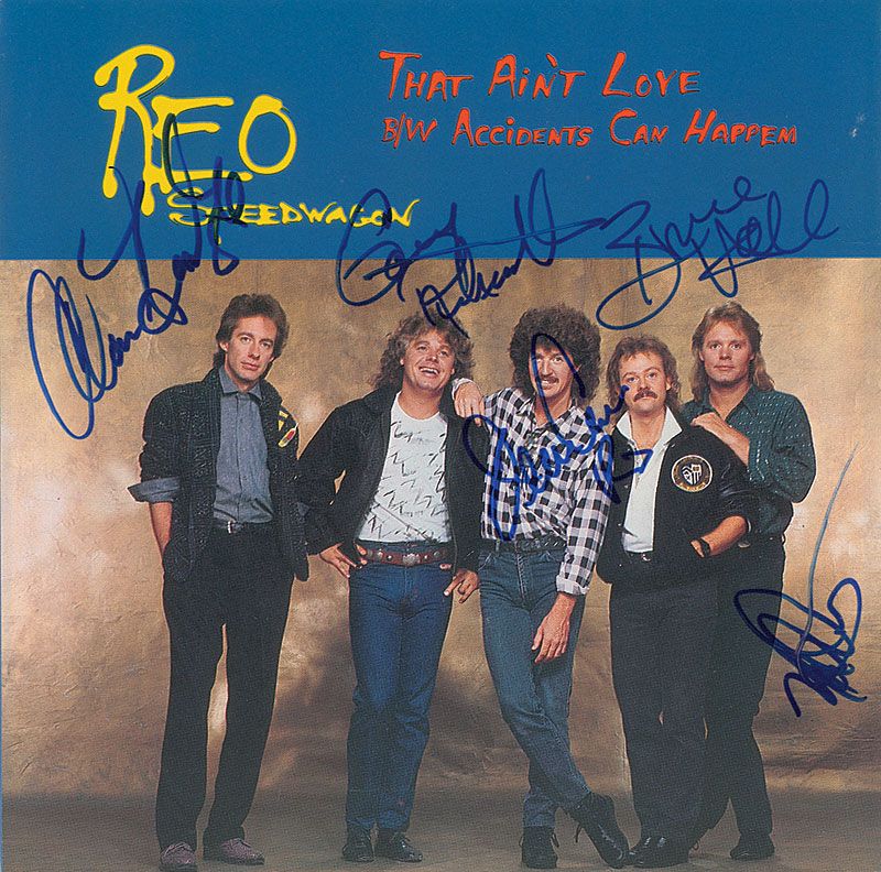 Color 45 rpm record sleeve for ‘This Ain’t Love,’ signed in blue felt tip by Kevin Cronin, Gary Richrath, Neal Doughty, Bruce Hall, and Alan Gratzer. In fine condition. Accompanied by a full letter of authenticity from Roger Epperson/REAL.