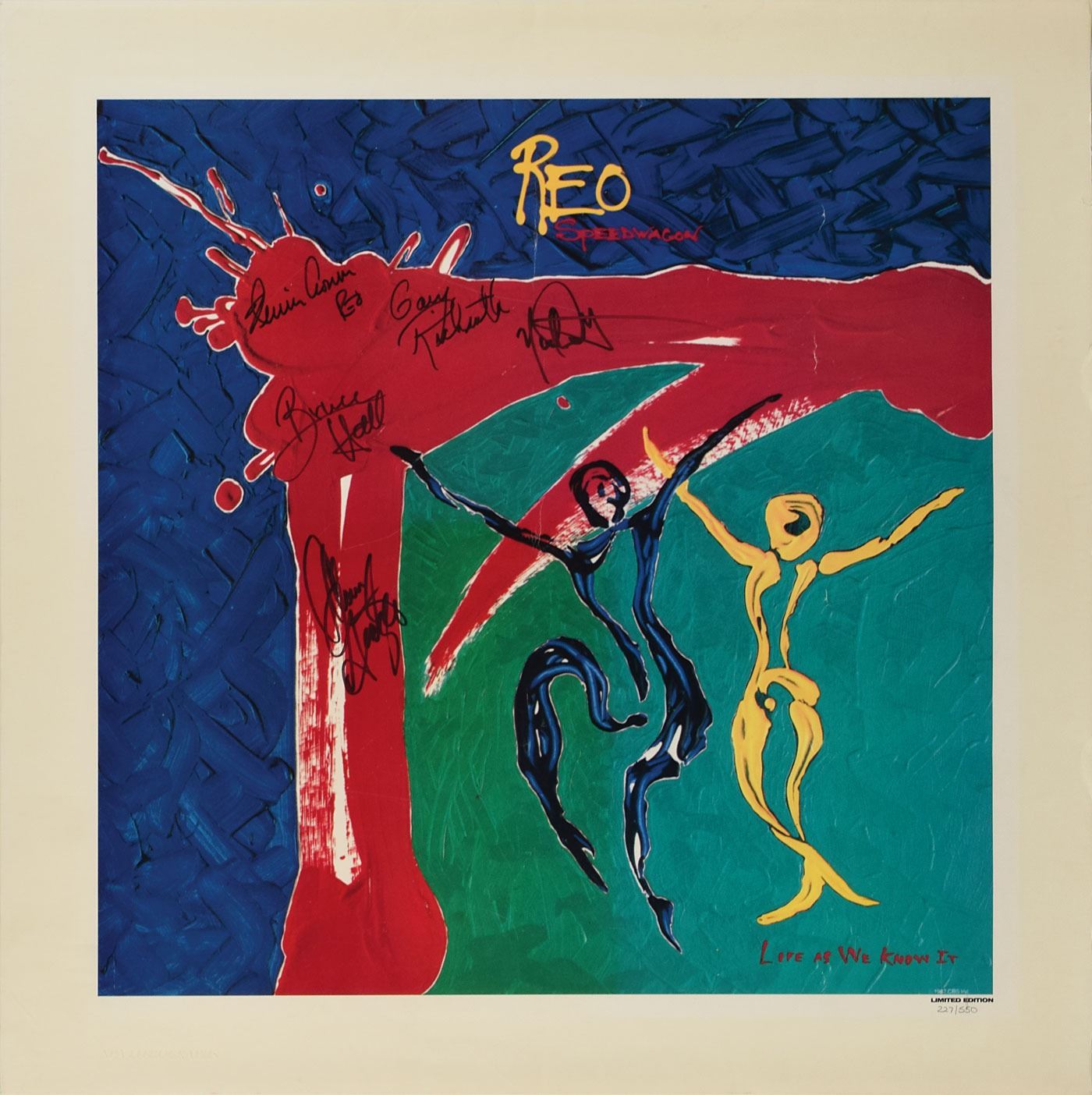 Limited edition color 22 x 22 lithograph of the front cover for REO Speedwagon's 1987 album Life as We Know It, numbered 227/550, signed in black felt tip by Kevin Cronin, Gary Richrath, Neal Doughty, Bruce Hall, and Alan Gratzer. Rolled and in fine condition, with scattered light creasing.