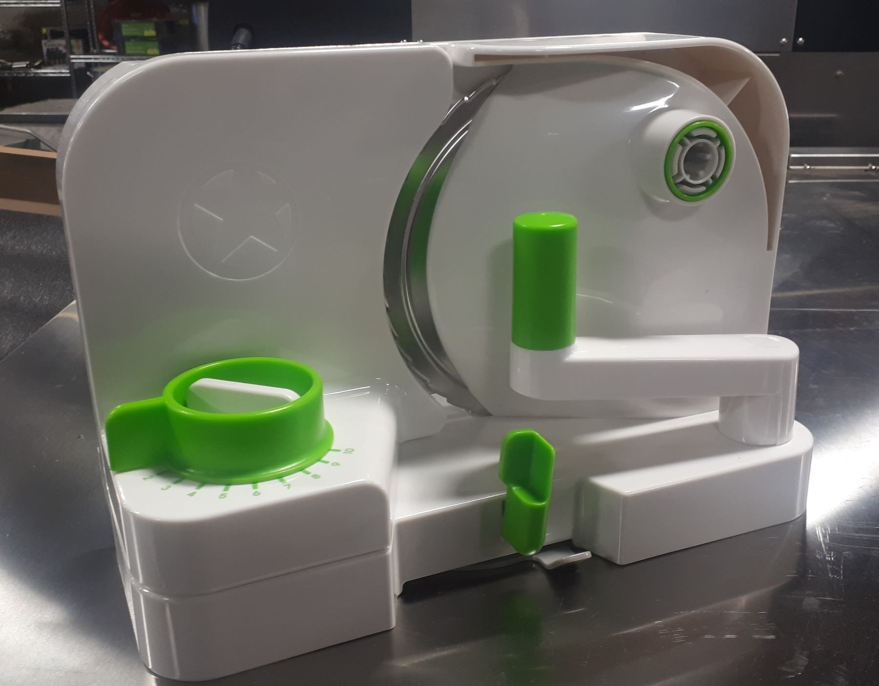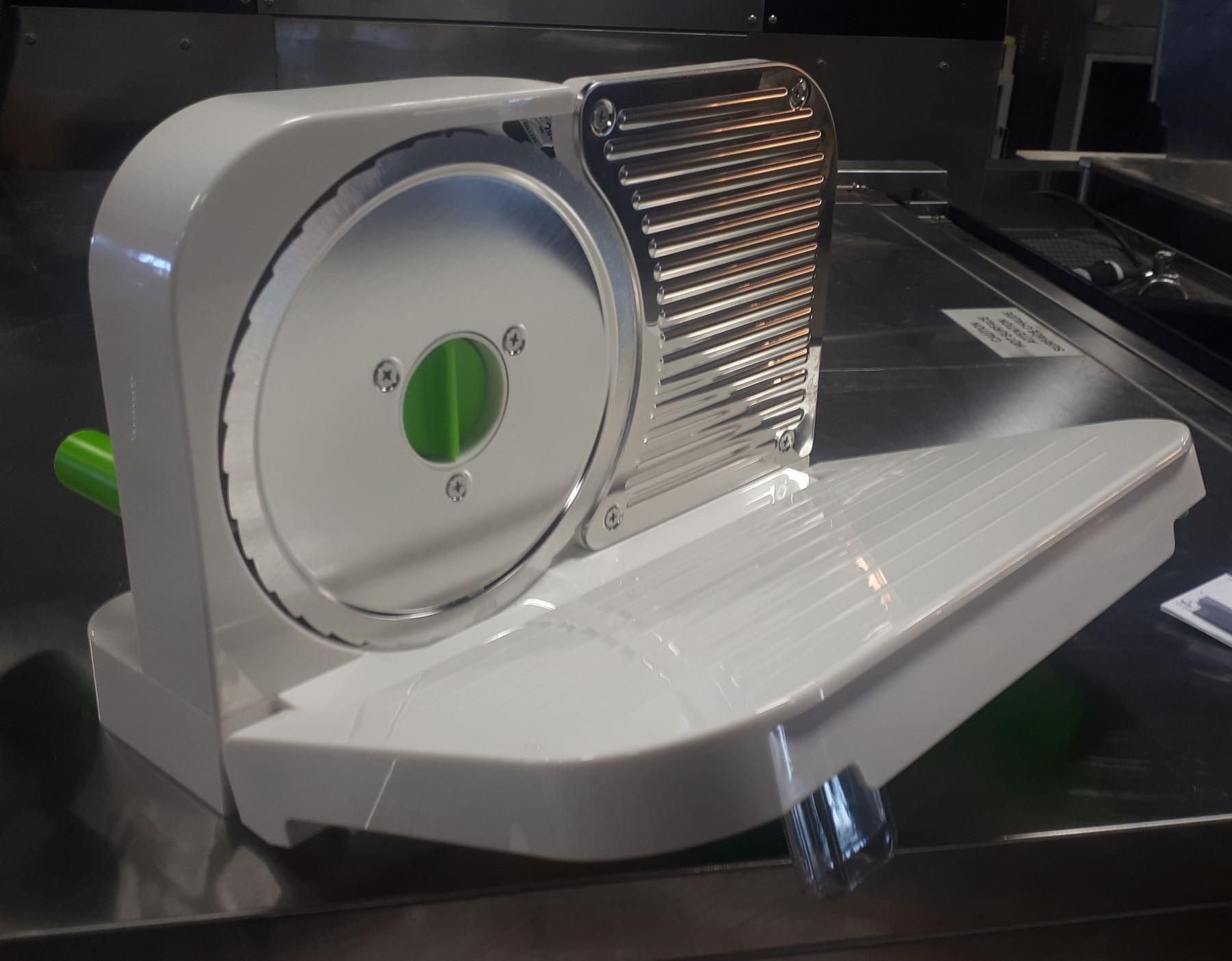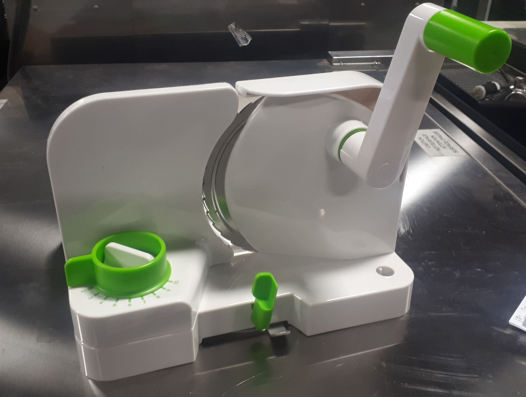 SLICES MEATS, CHEESE AND BREAD. CUTS EVENLY, SAFELY, AND EFFORTLESSLY. SERRATED STAINLESS STEEL BLADE, VARIABLE THICKNESS ADJUSTMENT UP TO 1" THICK. STURDY BASE AND EXTRA LARGE NON-SLIP SUCTION BASE. NESTING UNDER BASE STORAGE.
