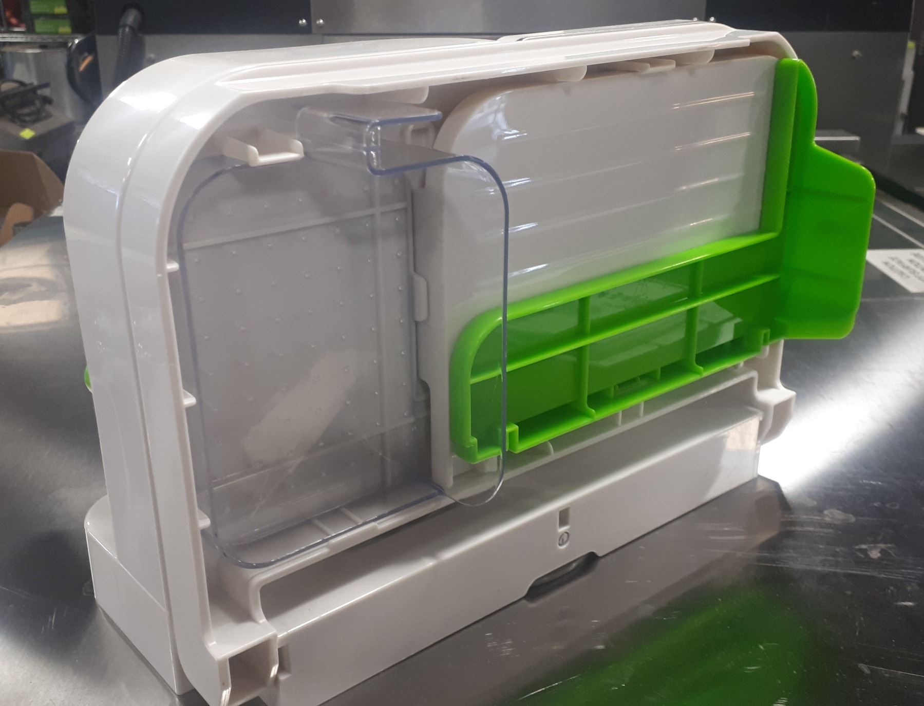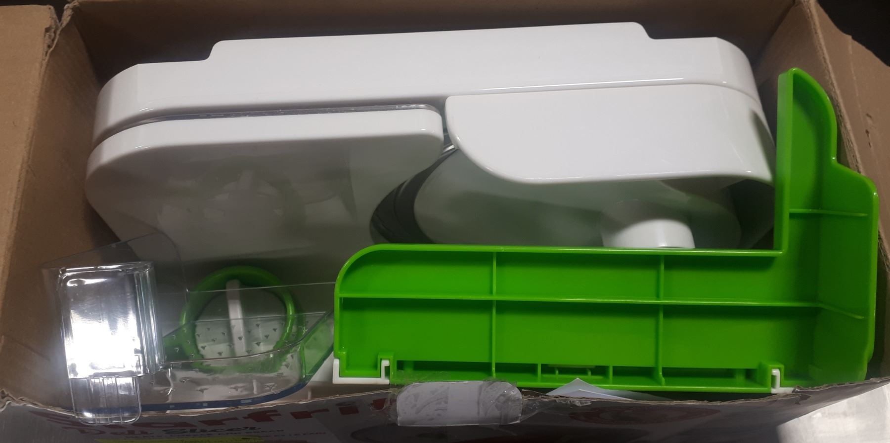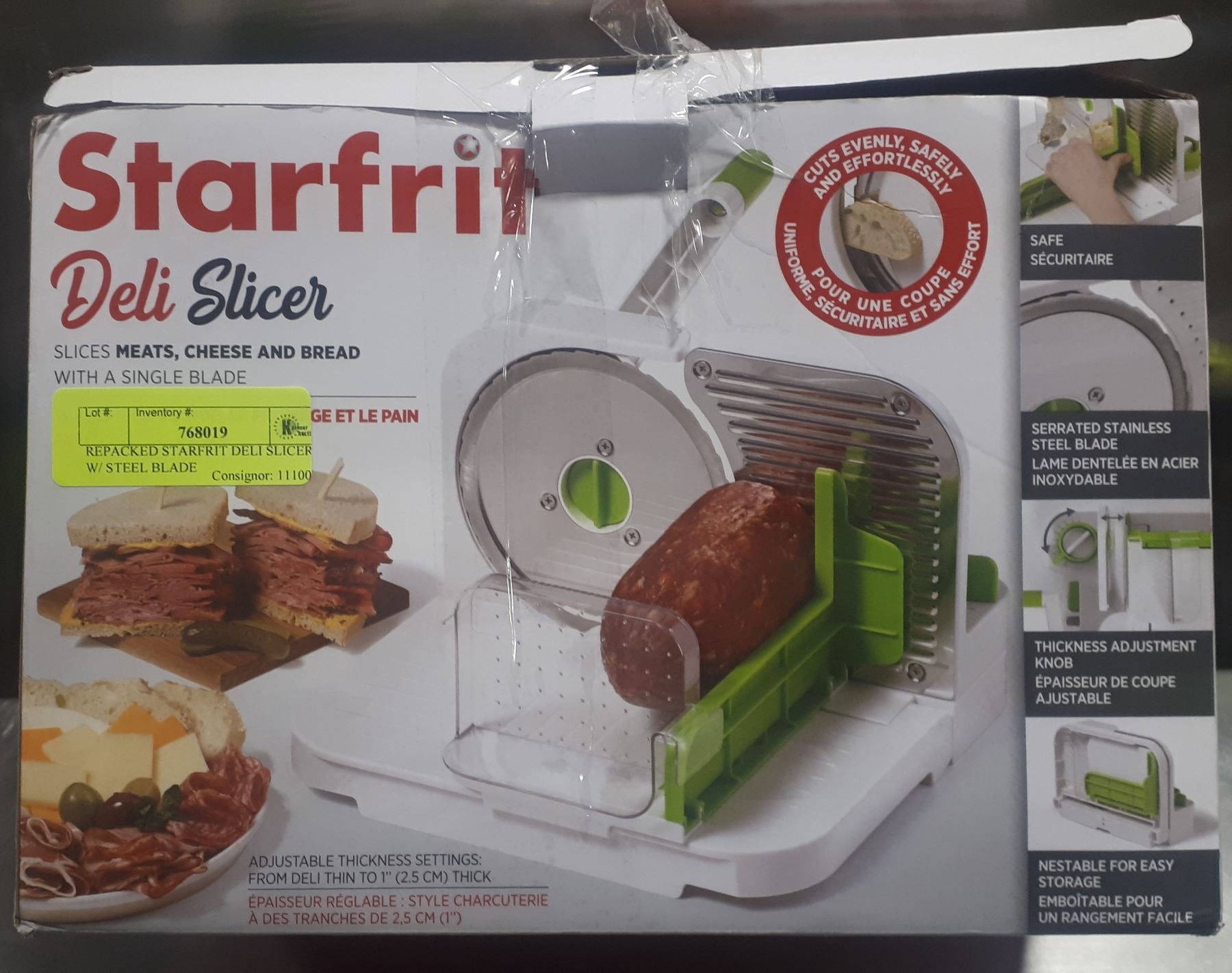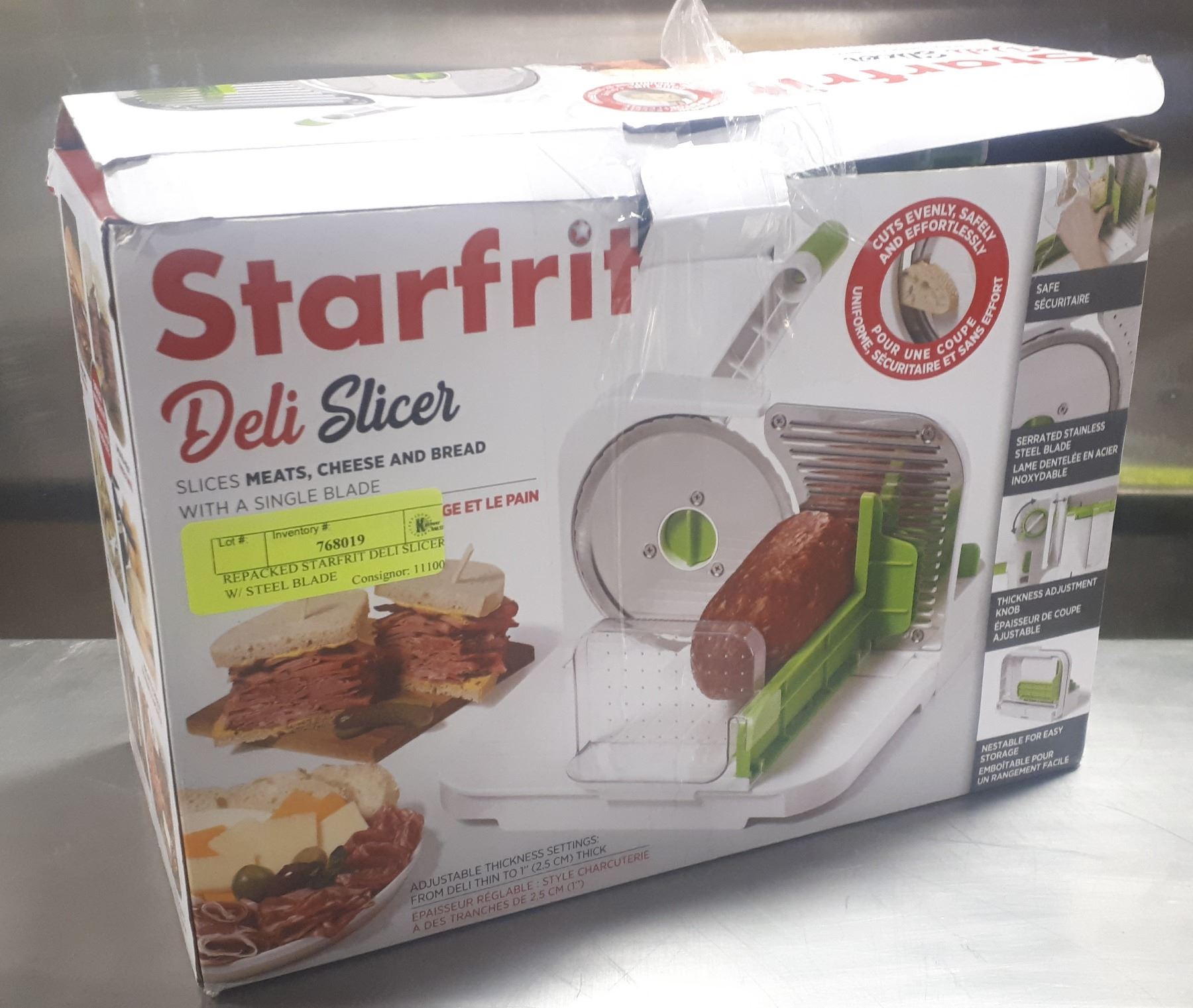 SLICES MEATS, CHEESE AND BREAD. CUTS EVENLY, SAFELY, AND EFFORTLESSLY. SERRATED STAINLESS STEEL BLADE, VARIABLE THICKNESS ADJUSTMENT UP TO 1" THICK. STURDY BASE AND EXTRA LARGE NON-SLIP SUCTION BASE. NESTING UNDER BASE STORAGE.