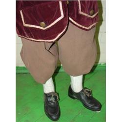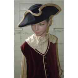 REPLICA COLONIAL CLOTHING FOR MALE YOUTH on mannequin. Include shirt, shoes, paints, socks vest, & tri-point hat. 48" H