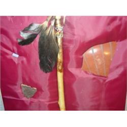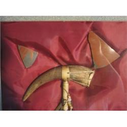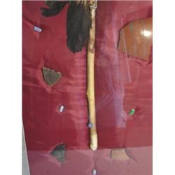 REPLICA NATIVE AMERICAN ARTIFACTS in wall mounted frame. Contains handled percussion object with pottery fragments. 20.5" x 35.5" framed.