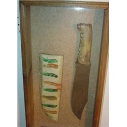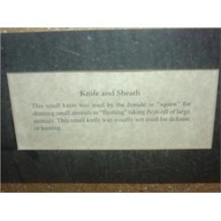 REPLICA NATIVE AMERICAN KNIFE & SHEATH in wall mounted frame. 10.75" x 25" framed.