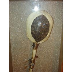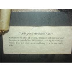 REPLICA NATIVE AMERICAN TURTLE SHELL MEDICINE RATTLE in wall mounted frame. 11" x 25" framed.