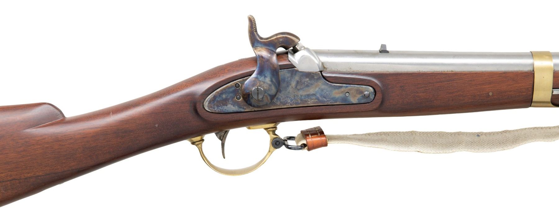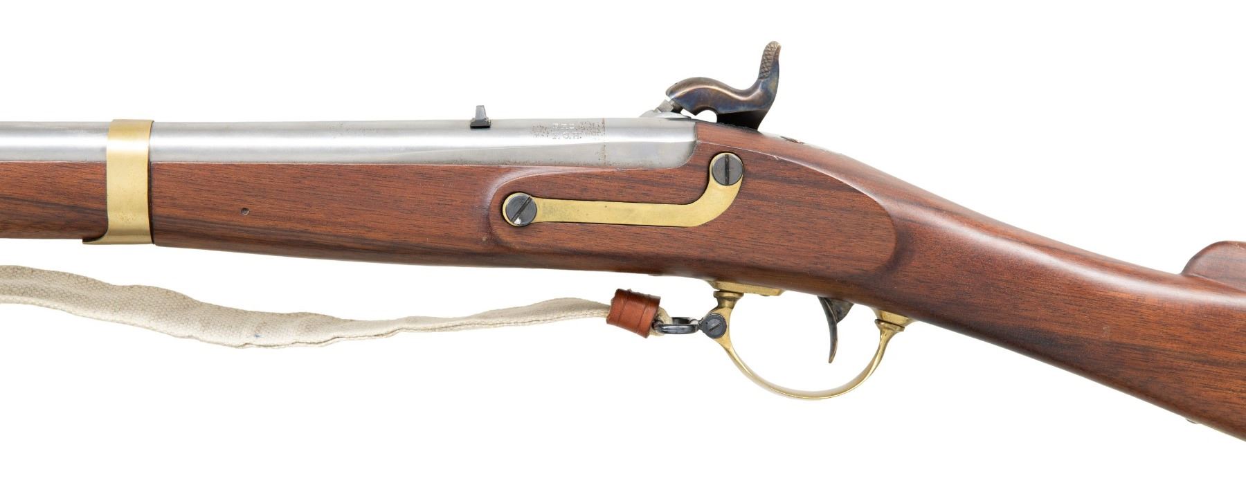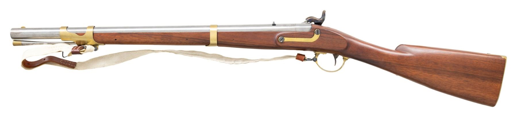 MUSKETOON. Cal. 58. NSN. A Italian style reproduction (likely Zoli) of a Civil War Confederate Artilley Musketoon produced in J.P. Murray Armory of Columbus, Georgia. In the white 23.5". Case colored lock. Carbine stock w/ brass furniture, white cloth sling & brass tipped ramrod. CONDITION: appears very good to near excellent with light handling marks & scattered spots of pinprick patina. Very good rifling with patina towards muzzle. (01-27406/MD). ANTIQUE. $300-400.