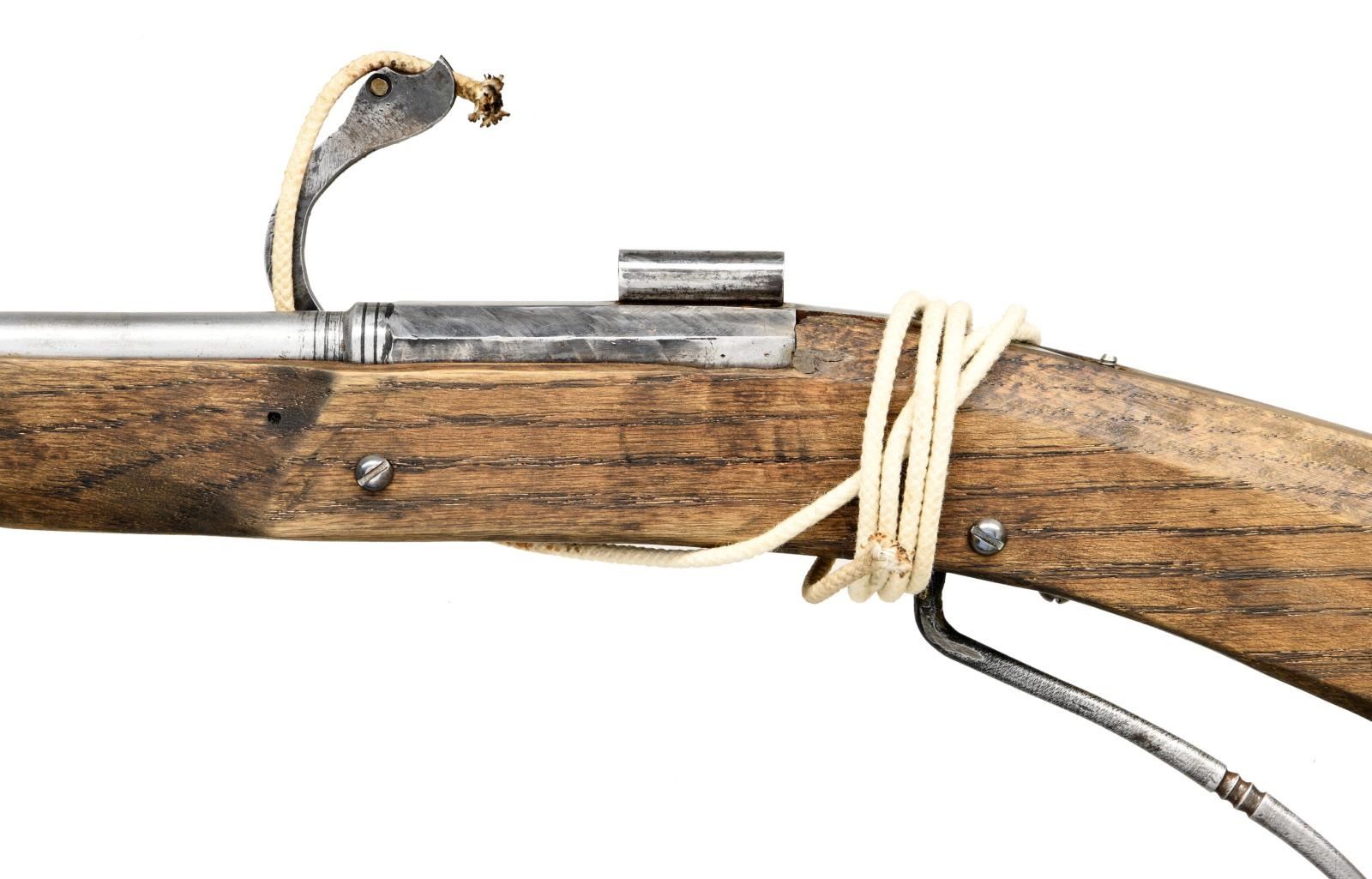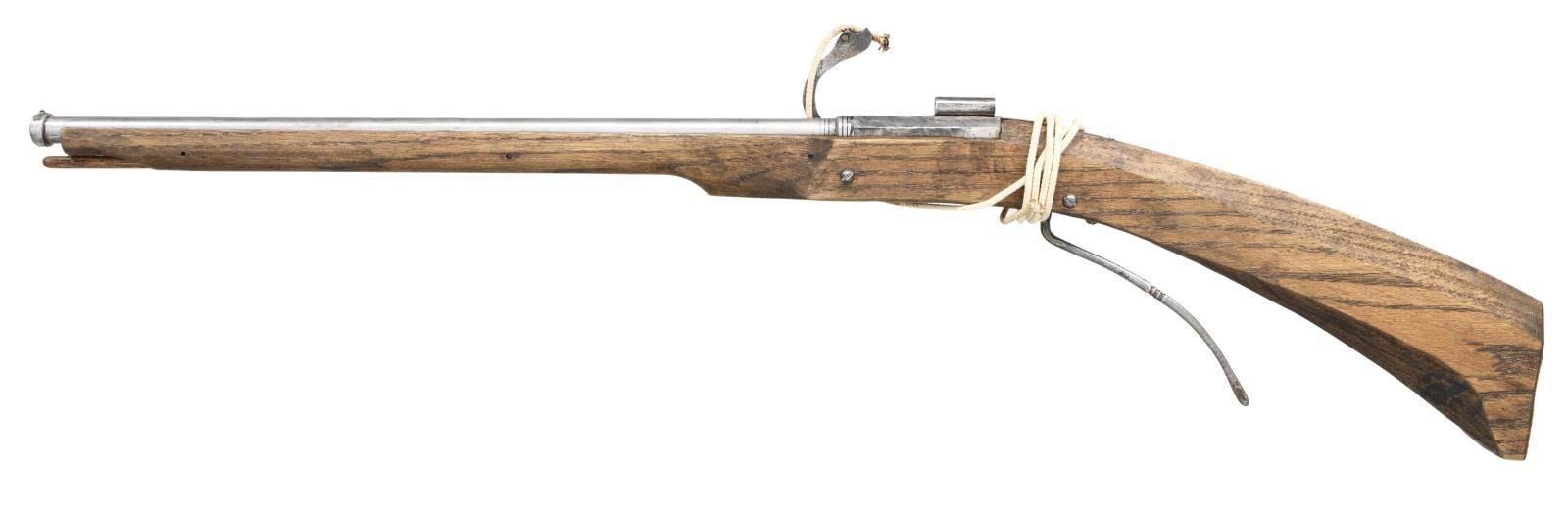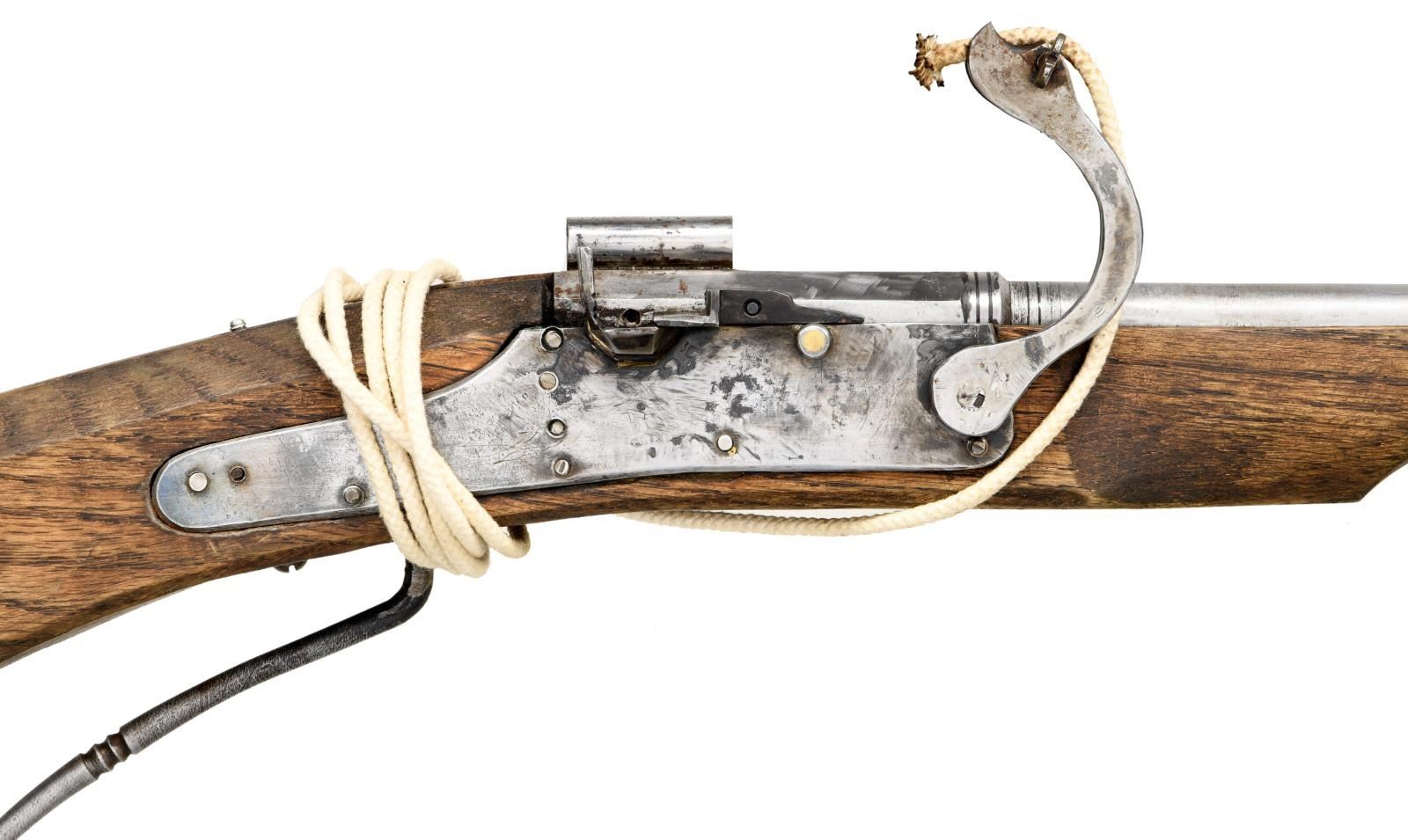 Cal. approx. 50. NSN. Bbl. 21". Fixed bead front sight. Brightly finished metal. No visible markings. Rope present. Hardwood stock. Hardwood ramrod. CONDITION: stock shows handling wear & light chips. Metal shows scattered oxidation. Good rifled bore. (01-23737/MJC). ANTIQUE. $200-400.