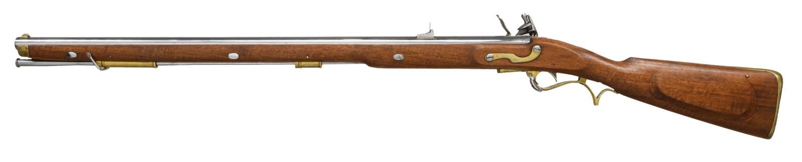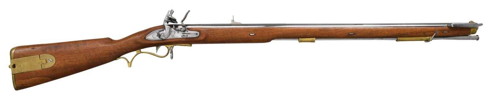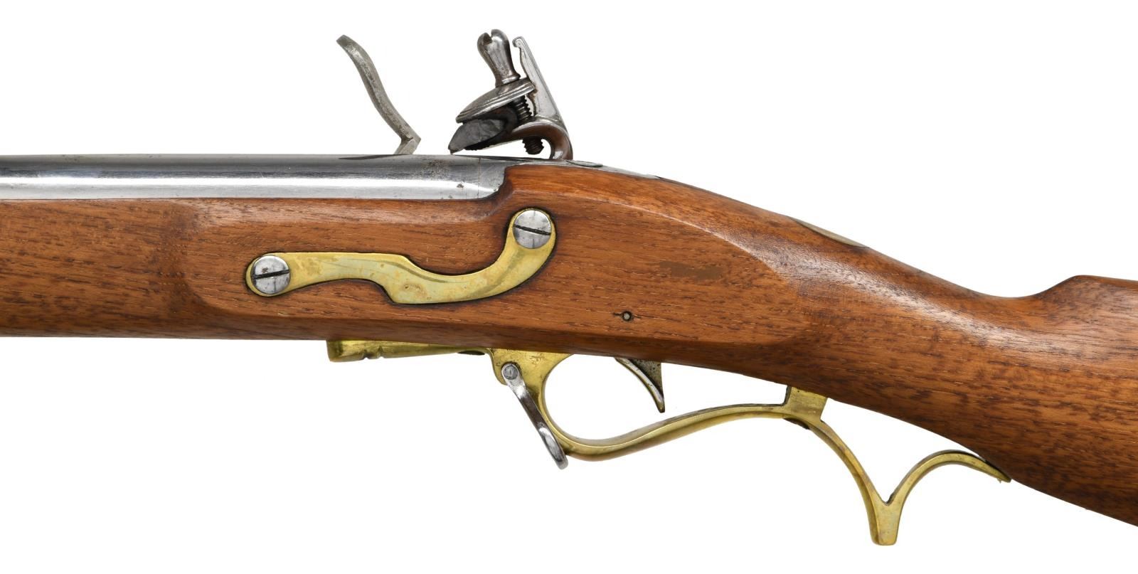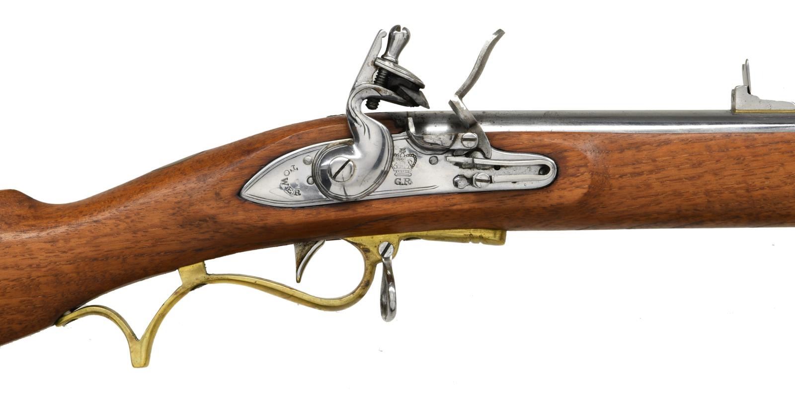 Cal. 65. NSN. Bbl. 30 1/2". Lock has British style crown/"G.R." & "TOWER" markings. No other visible markings. Dual leaf folding rear sight. Brass blade front sight. Bright finish w/ brass furniture. Bayonet bar for sword bayonet. Walnut stock w/ bottom mounted sling swivels & patch box. Ramrod present. CONDITION: stock shows a chip forming in ramrod channel & some light handling wear. Brass parts show scattered oxidation & some dings. Bright parts remain mostly bright w/ some scattered light oxidation. Good smoothbore. (01-23765/MJC). ANTIQUE. $300-500.