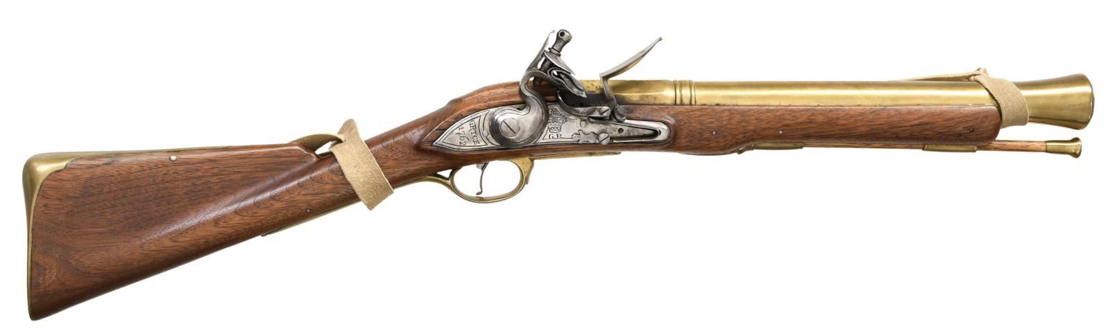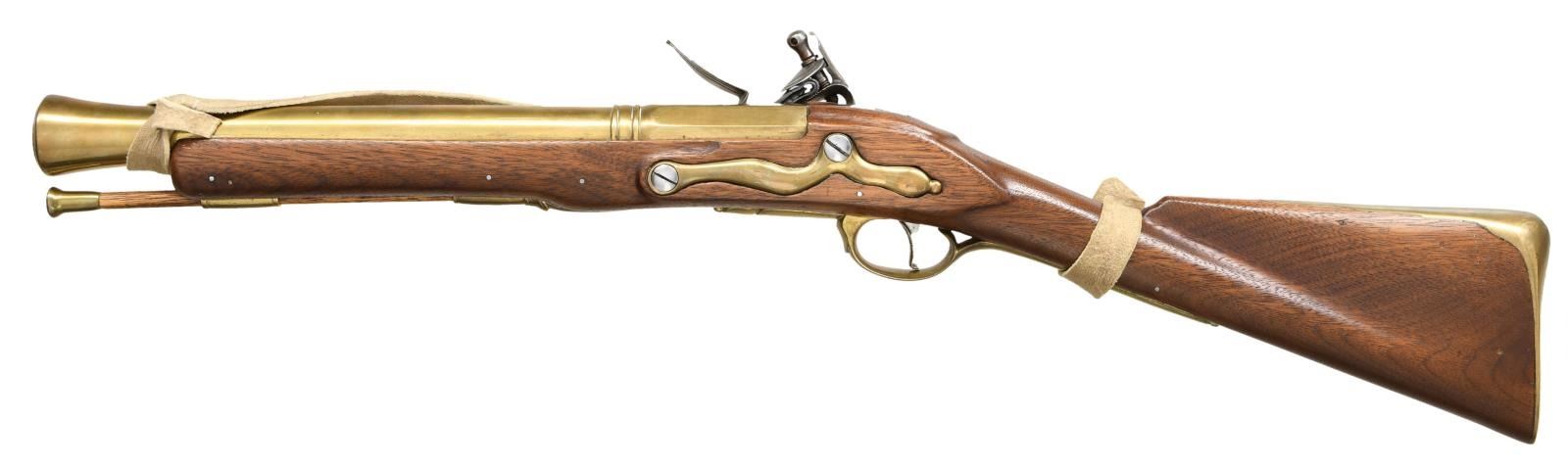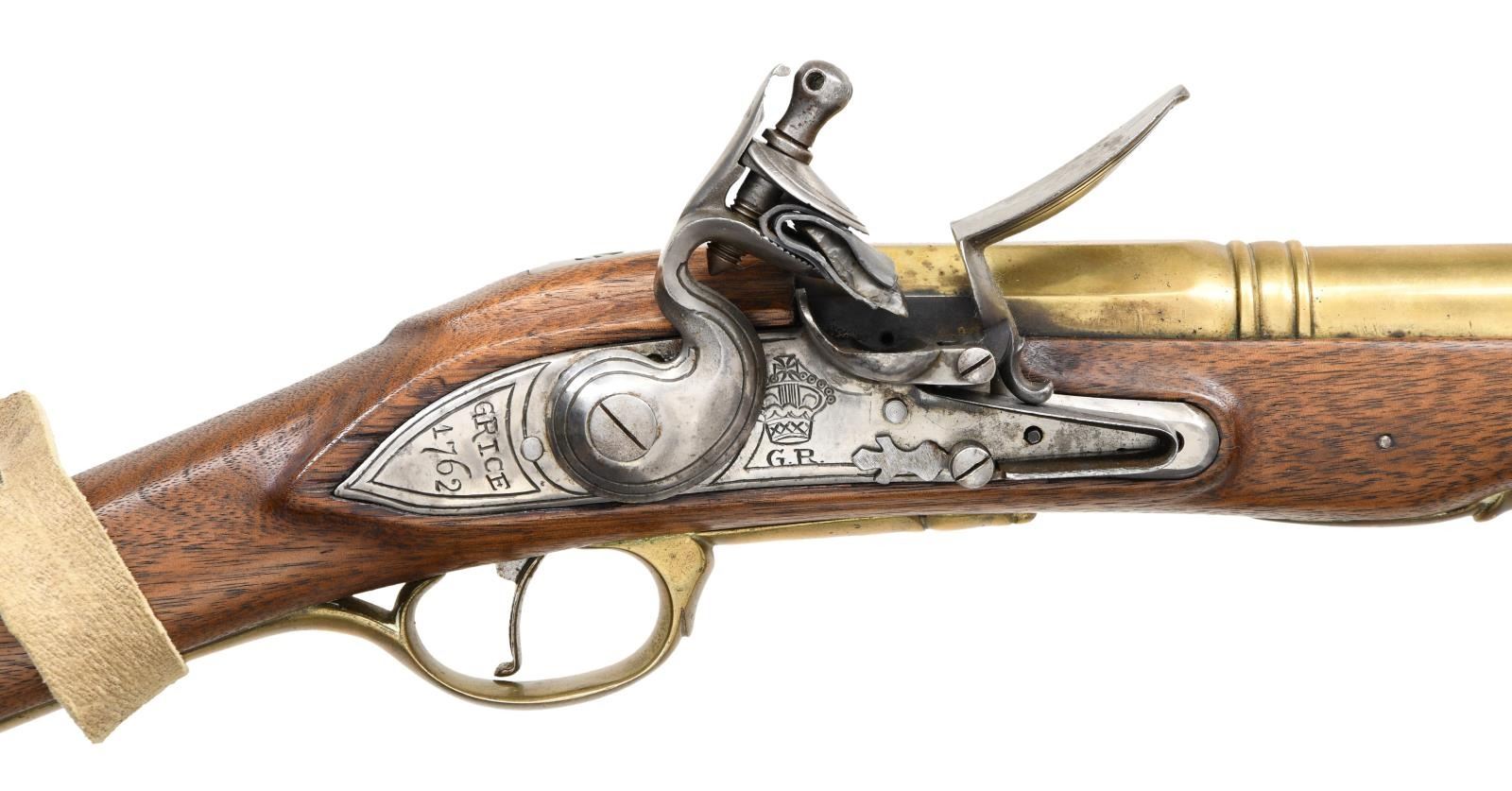 Cal. approx. 1 3/8" at bell. NSN. Bbl. 15 1/4". Lock marked w/ British crown/"GR" & "Grice/1862". Brass furniture. Walnut stock w/ sling. Brass tipped ramrod. CONDITION: stock shows some dings, staining & handling wear. Brass parts show a few spots of light pitting & scattered oxidation. Bright lock assembly & upper tang show some light oxidation. Bore shows scattered oxidation. (01-23679/MJC). ANTIQUE. $300-500.
