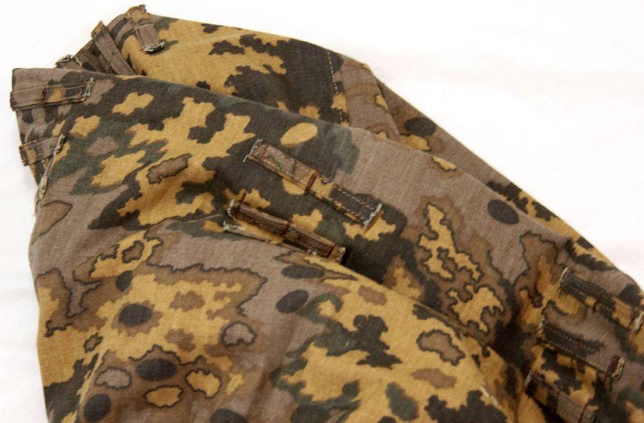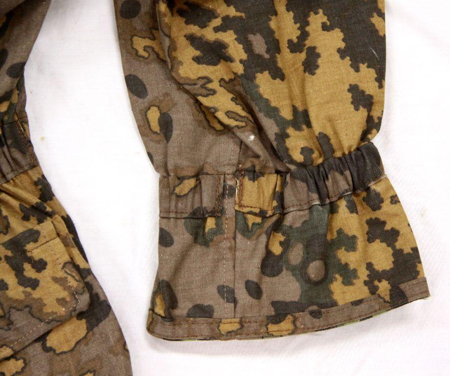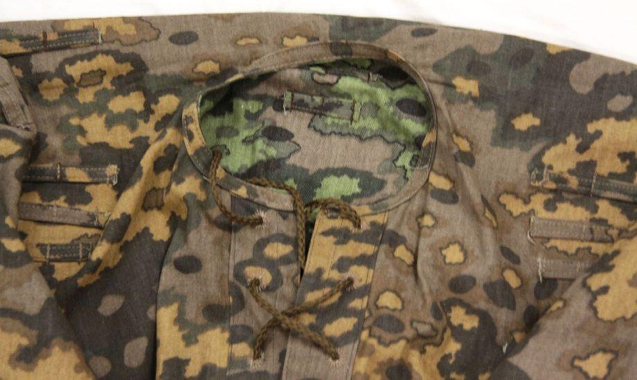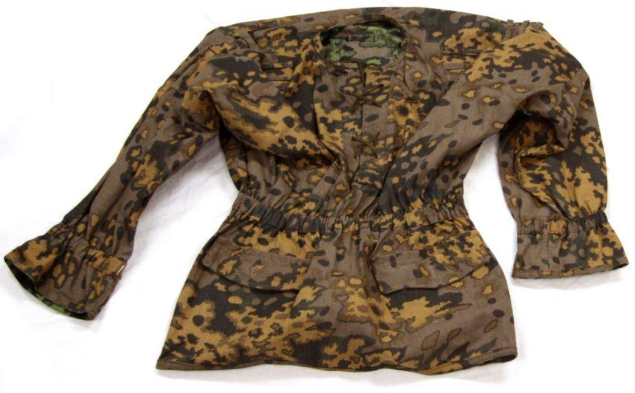 Reproduction Waffen SS type II camouflage reversible pullover smock. Elasticized waist and cuffs. High quality construction, with very good detail. No buttons on pockets. Very good condition.