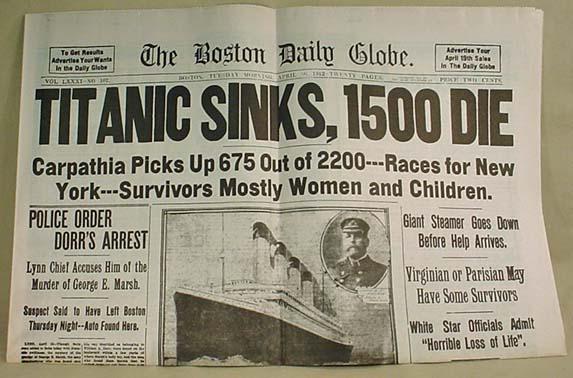REPRODUCTION 1912 BOSTON DAILY GLOBE NEWSPAPER - TITANIC SINKS 1500 DIE HEADLINE