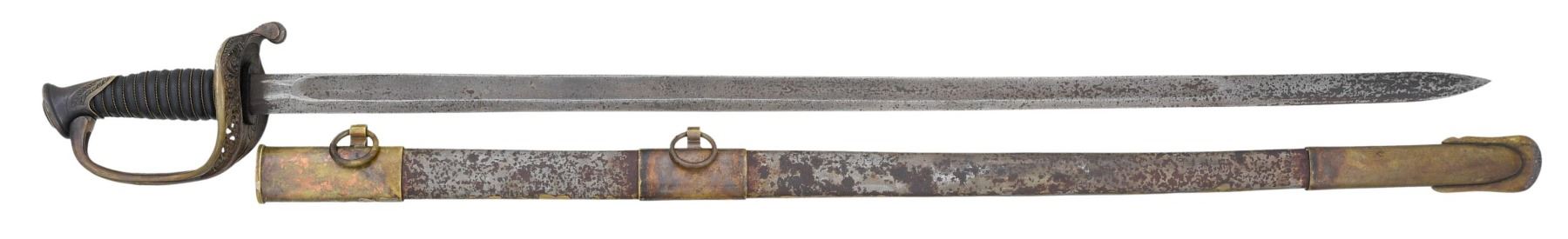 , TENNESSEE FOOT OFFICER'S SWORD. A high quality reproduction Confederate Foot officer's sword originally produced by Leech & Rigdon of Memphis, Tennessee. The sword measures 39 1/4" overall and has a blade length of 32 1/4". The plain blade has a single wide unstopped fuller and is unmarked. Brass hilt with pierced foliate decorated guard and a "CS" in oval on the inner top of the guard. Laurel leaves decorate the pommel. Wire wrapped leather grip. Iron bodied scabbard with brass mounts. CONDITION: blade has a mottled gray patina with scattered light staining. Hit has a dark mustard patina and the grip shows little wear with no losses. The scabbard has a mottled patina on the iron and a rich mustard patina on the brass. (02-24820/BF). $400-600.