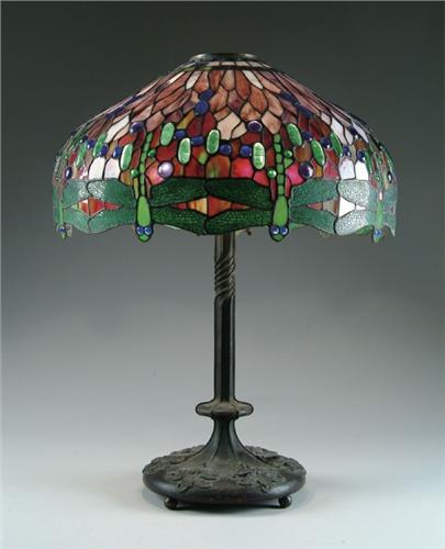 REPRODUCTION DROP-HEAD DRAGONFLY LAMP. Very large drop-head dragonfly shade has purple slag background glass with green dragonflies with blue eyes and is further decorated with blue, green and lavender jewels. The shade rests atop a period Art Nouveau lamp base with raised flowers around the foot and applied stems extending up and around the riser to meet the four socket cluster. SIZE: Shade is 24 in. dia. Overall height is 34-1/2 in.. CONDITION: Shade has several cracked panels but all are intact and tight. Estate of Edwin Schiebel Sr. 5-60011