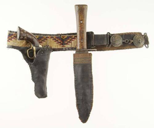 REPRODUCTION INDIAN AGENT BEADED BELT AND HOLSTER RIG WITH KNIFE AND SHEATH. Revolver is a Manhattan Pocket Model. Cal 36. SN 3976. It has 4" oct bbl with brass frame and one-piece walnut grip. It has spurious "Bureau of Indian Affairs" markings over all pieces. Real Indian Agent marked items are usually marked, "Department of the Interior". Grip has patterns of brass tacks added on both sides. Knife is homemade, probably from a saw blade and is 9-3/4" long, dbl edged, 16" overall with a large elliptical hand guard and one piece oak handle. Accompanied by a homemade burlap lined beaded leather belt with rawhide holster and knife sheath. Also spuriously marked "BIA". It has a reproduction copper or bronze 2-pc belt buckle with eagle embossing on right side and a high-relief buffalo head on left other. There is "US" on either side of the buffalo head with "AGENT" above and "BIA" stamped below with other spurious markings around the rim. The beading is good and appears to have been from an old piece of beadwork using white heart beads in white, red, blue and yellow colors. It appears to be beaded on sinew. CONDITION: Revolver, poor, pitted gray finish, cracked grip, missing wedge. Mechanics are loose. Poor bore. Knife smooth gray finish, good handle. Belt, holster & sheath are very hard, apparently having been lacquered. Some losses of burlap lining and a few losses of beads. 4-57702 JR481