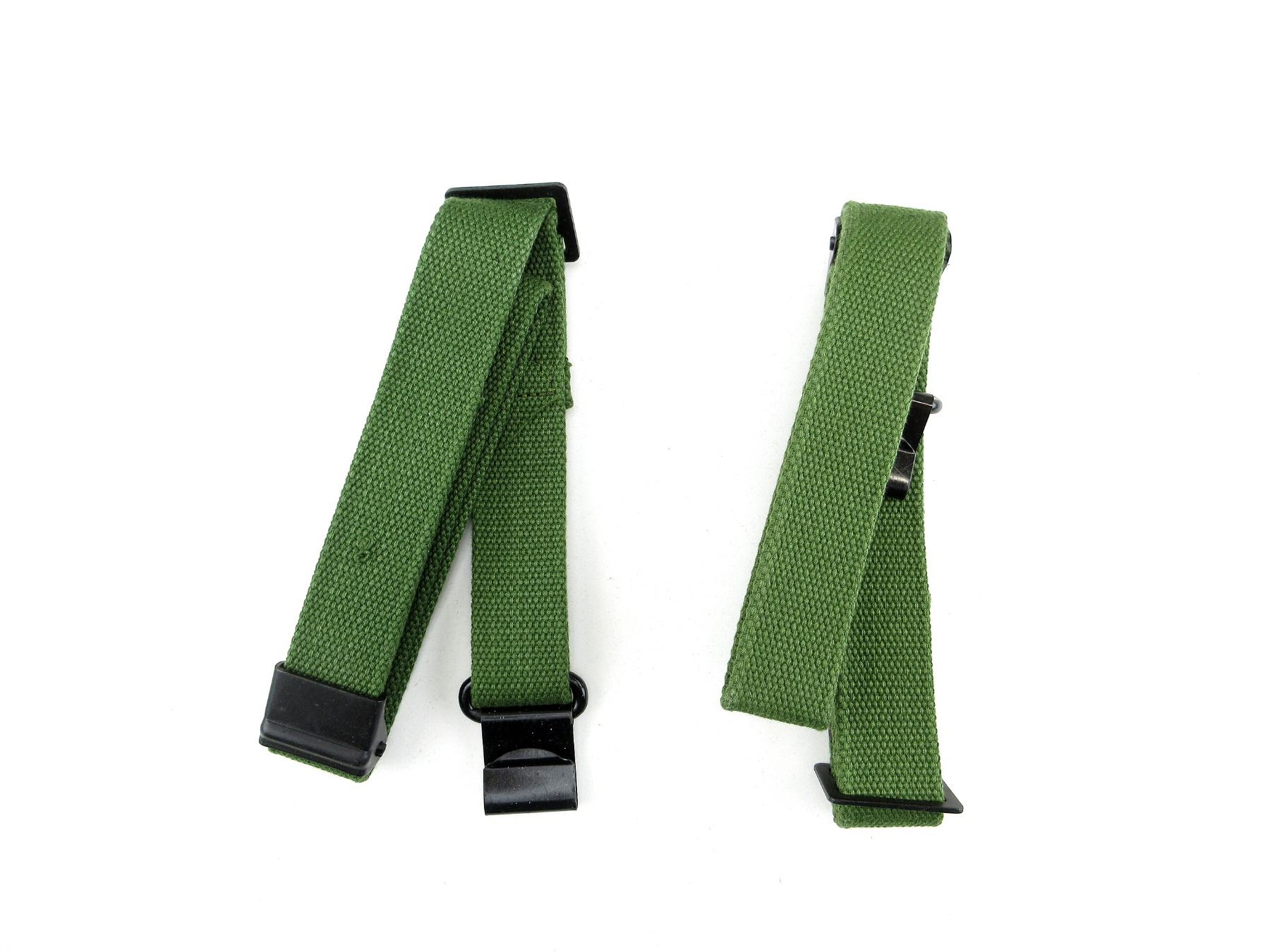 LOT INCLUDES; (2) GREEN CANVAS M1 GARAND SLINGS, APPEARS NOS, NO VISIBLE MARKINGS, BLACK PAINTED METAL FITTINGS, OALS APPROX. 22.75", ADJUSTABLE. SEE PHOTOS.