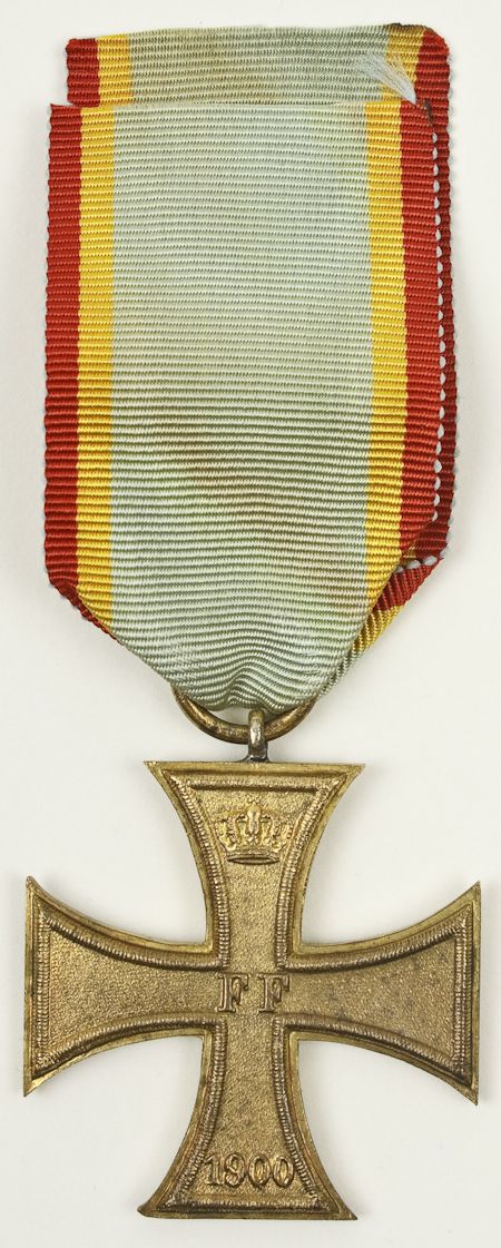 Reproduction of the 1900 Military Merit Cross (Mecklenburg-Schwerin), 2nd Class, with ribbon. Ribbon is slightly stained, trimmed at top. The 1900 was struck for Mecklenburgers who had distinguished themselves in the Boxer Rebellion of 1900-1901.