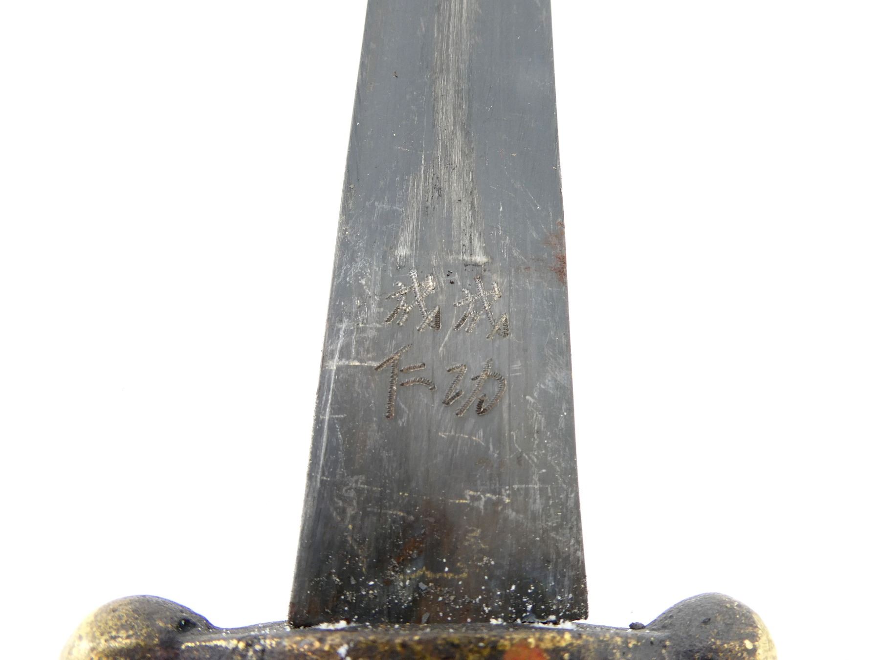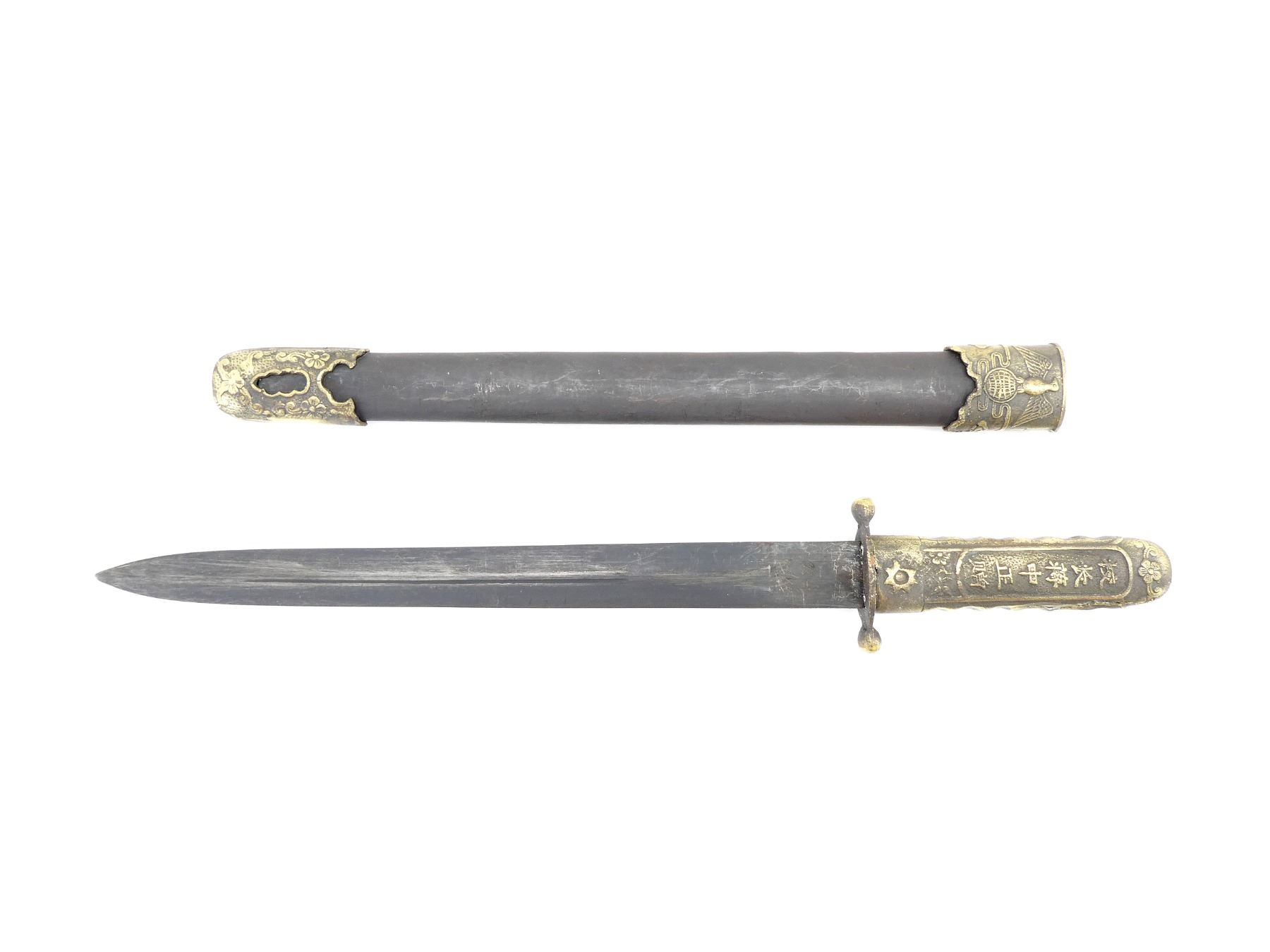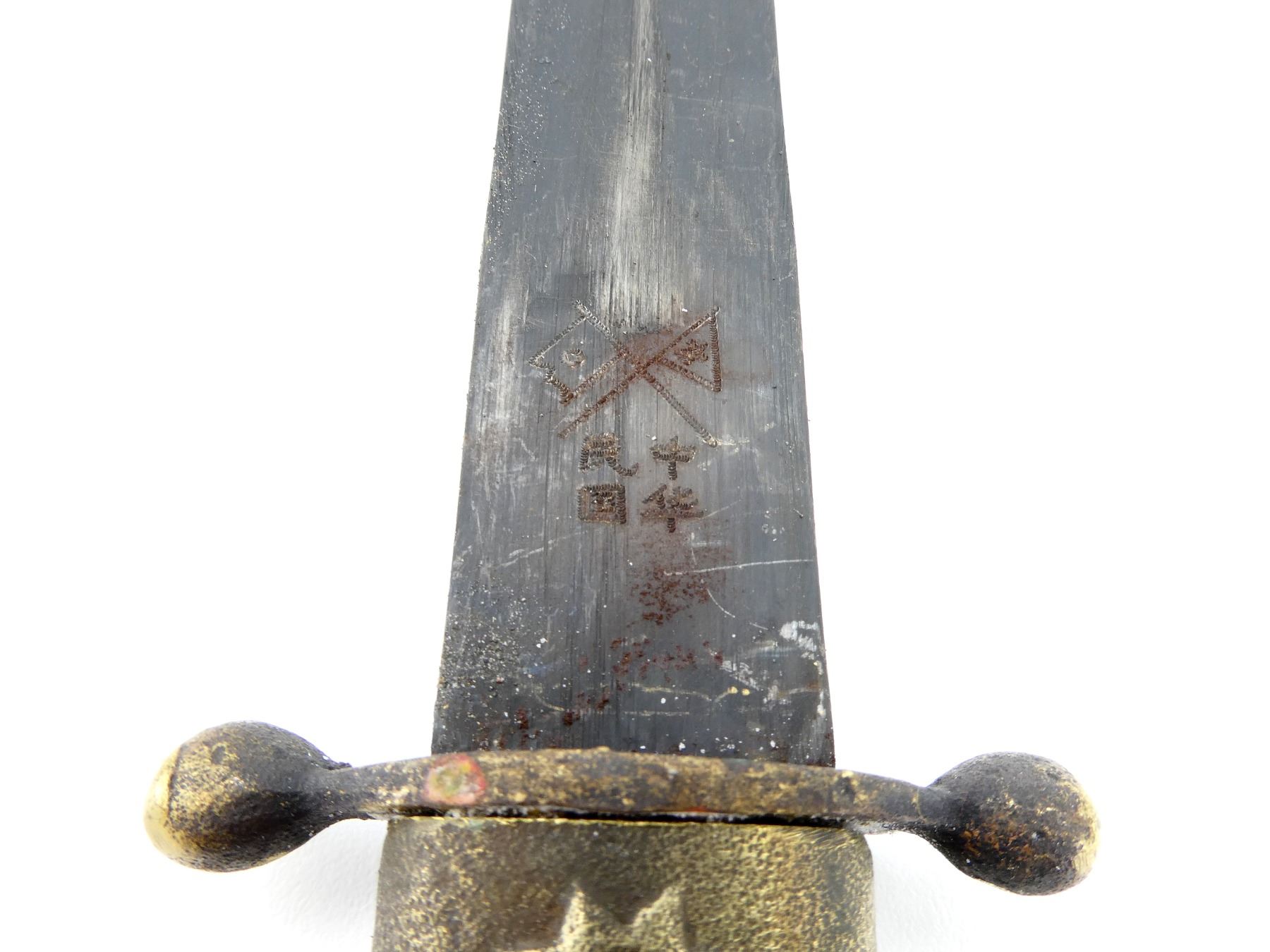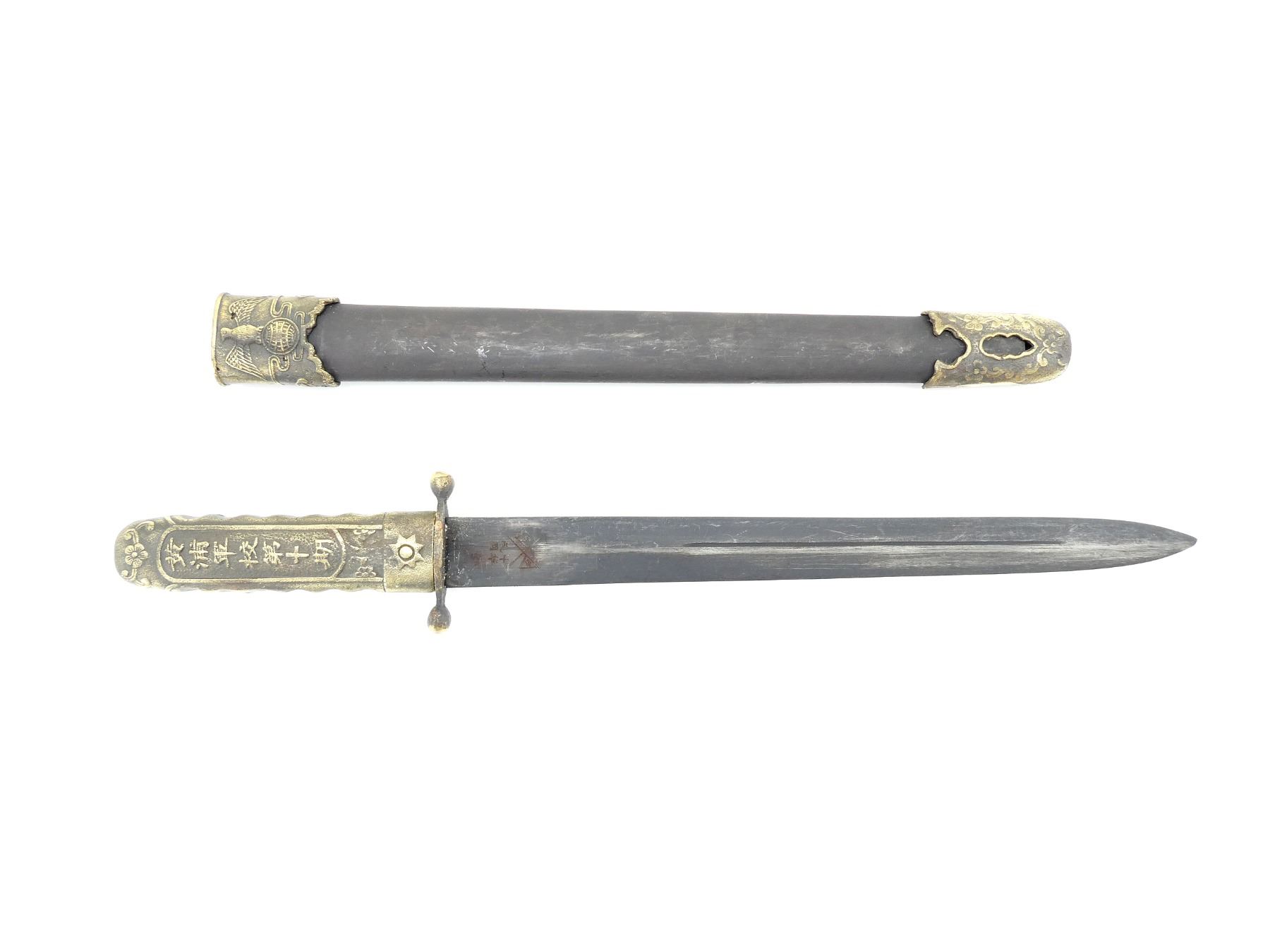 (1) SINGLE-EDGED DAGGER, RICASSO MARKED WITH VARIOUS CHINESE CHARACTERS ON EITHER SIDE, CHINESE NATIONALIST FLAG ON ONE SIDE WITH "47174", FLORAL SHAPED BRASS CROSS-GUARD WITH FLORAL DESIGNS, SCABBARD RELEASE BUTTON WITH CHINESE CHARACTERS ON EITHER SIDE OF BUTTON, BRASS GRIP / POMMEL, GRIP DESIGNED / ETCHED TO LOOK WRAPPED, METAL LOOP THROUGH POMMEL WITH LEATHER THONG / KNOT ATTACHED, BRASS WRAPPED WOOD SCABBARD, MARKED WITH VARIOUS CHINESE CHARACTERS ON EITHER SIDE, CHECKERED / FLORAL DESIGN ON SCABBARD, DECORATIVE PIECE WITH METAL HANGER & LEATHER TAB, BLADE APPROX. 10 3/8" & OAL APPROX. 15.5". SEE PHOTOS.