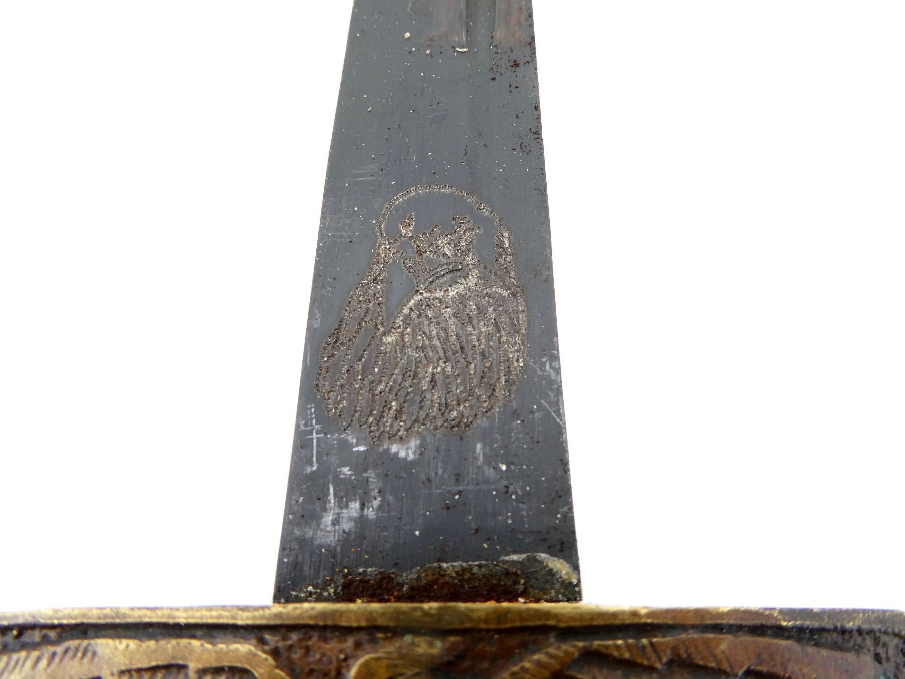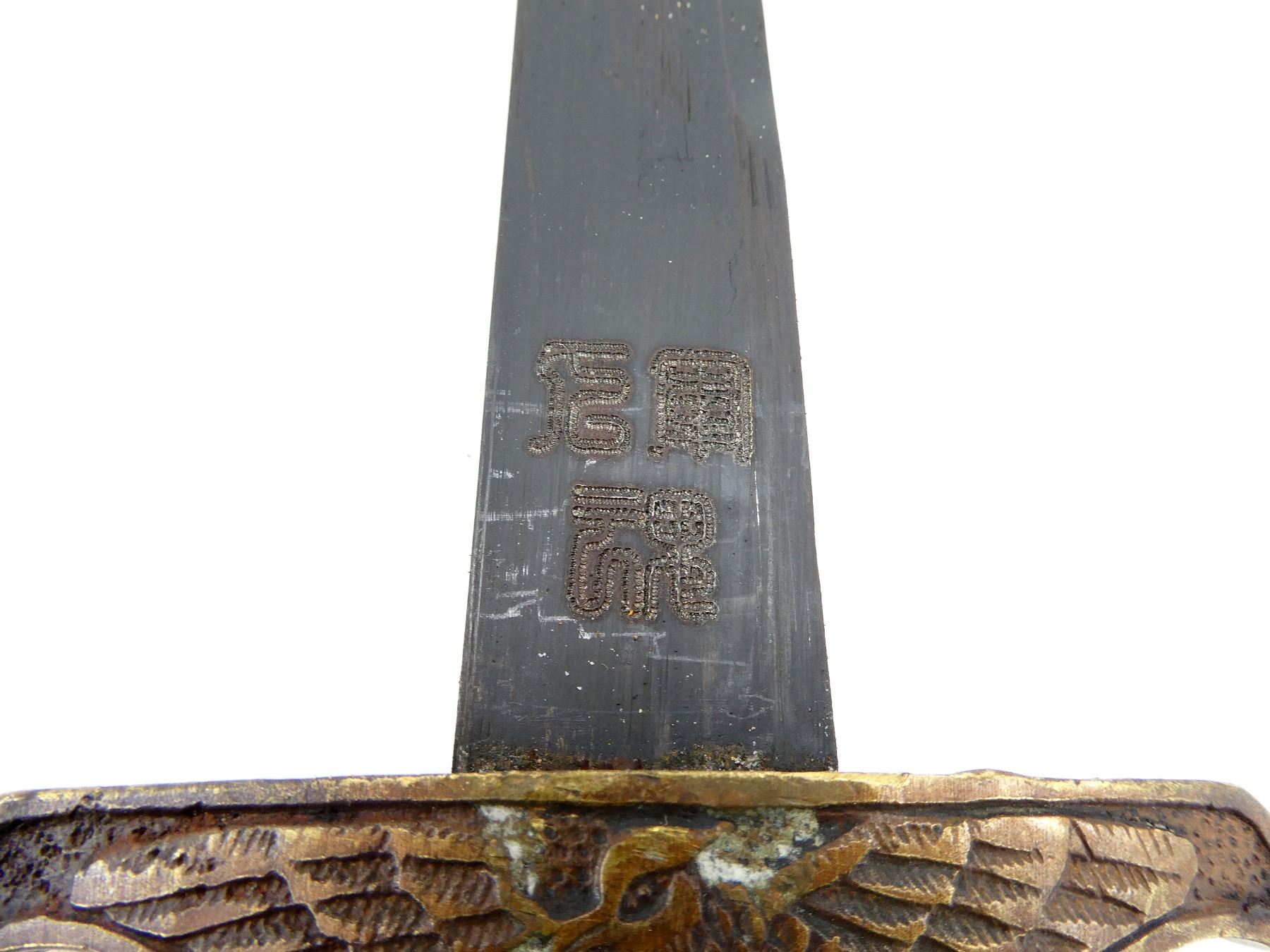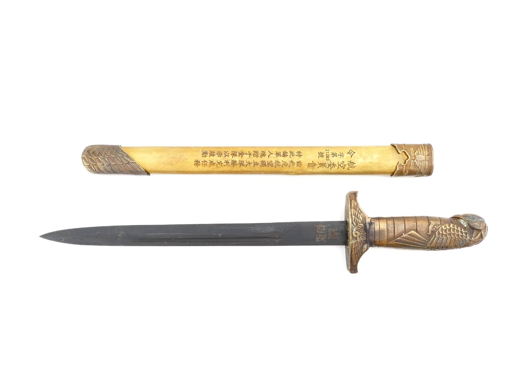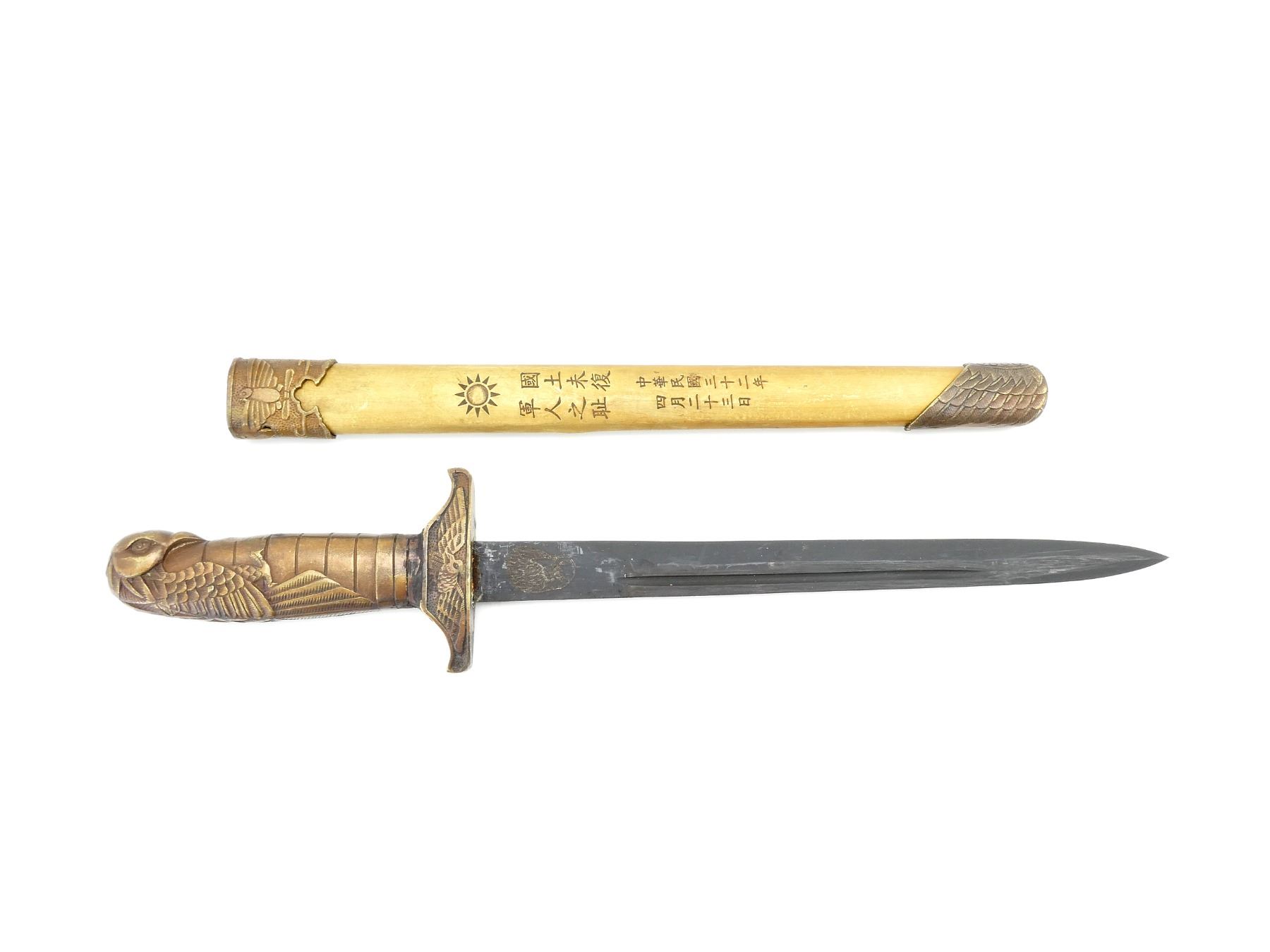 (1) SINGLE-EDGED DAGGER, RICASSO MARKED WITH VARIOUS CHINESE CHARACTERS ON ONE SIDE, OTHER-SIDE HAS ETCHED EAGLES HEAD DESIGN, BRASS CROSS-GUARD WITH EAGLE DESIGN, BRASS GRIP & POMMEL, GROOVED GRIP, EAGLE HEAD SHAPED POMMEL WITH EAGLES BODY / WINGS WORKED DOWN THE BACK-SIDE OF GRIP, BRASS SCABBARD WITH BRASS ENDS, EAGLE DESIGN ON THROAT END, EAGLE WING DESIGN ON TIP END, MARKED WITH VARIOUS CHINESE CHARACTERS ON EITHER SIDE OF SCABBARD, BLADE APPROX. 10 7/8" & OAL APPROX. 16". SEE PHOTOS.