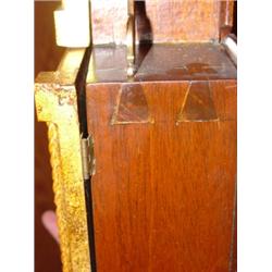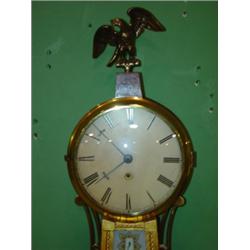 Reproduction Simon Willard banjo clock. Ca. 1980 and made of walnut. Has dovetail case and decorative eagle on top. 34" H.