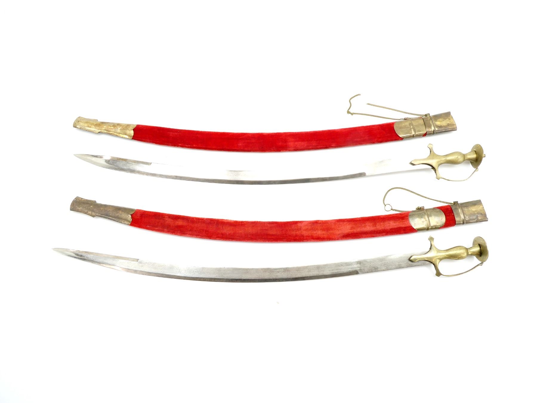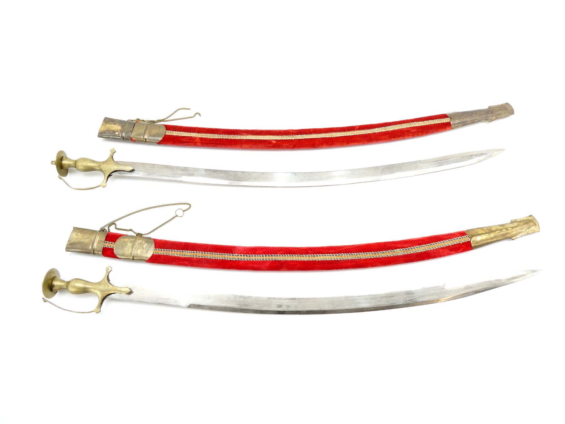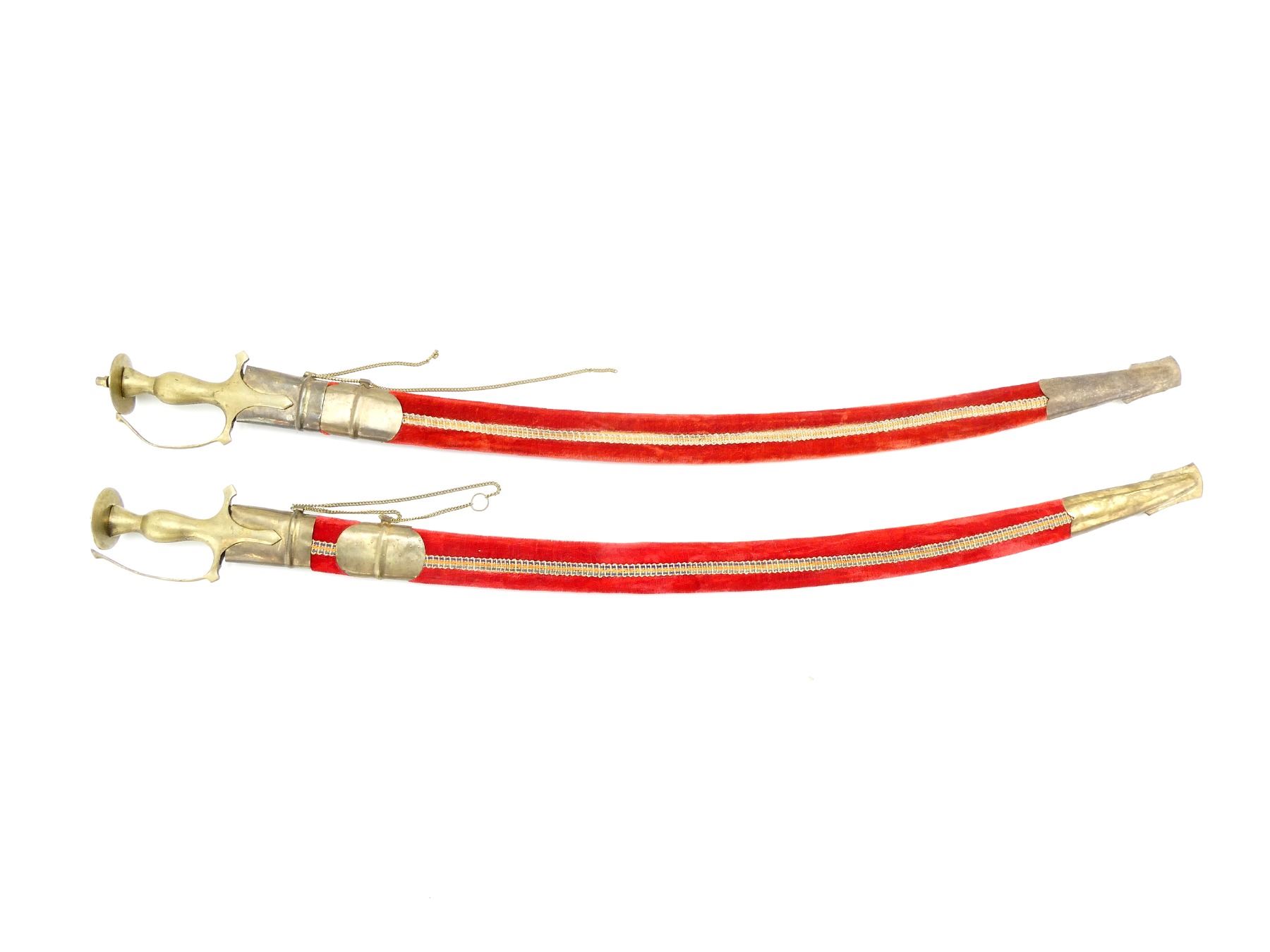 LOT INCLUDES; (2) STEEL BLADES, WITH FADED DECORATIVE ETCHING, MARKED: "MADE IN INDIA", BRASS HANDLES, RED FELT COVERED WOOD SCABBARDS, BLADE APPROX. 29.25"-29.75" & OAL APPROX. 33"-33.75". SEE PHOTOS.