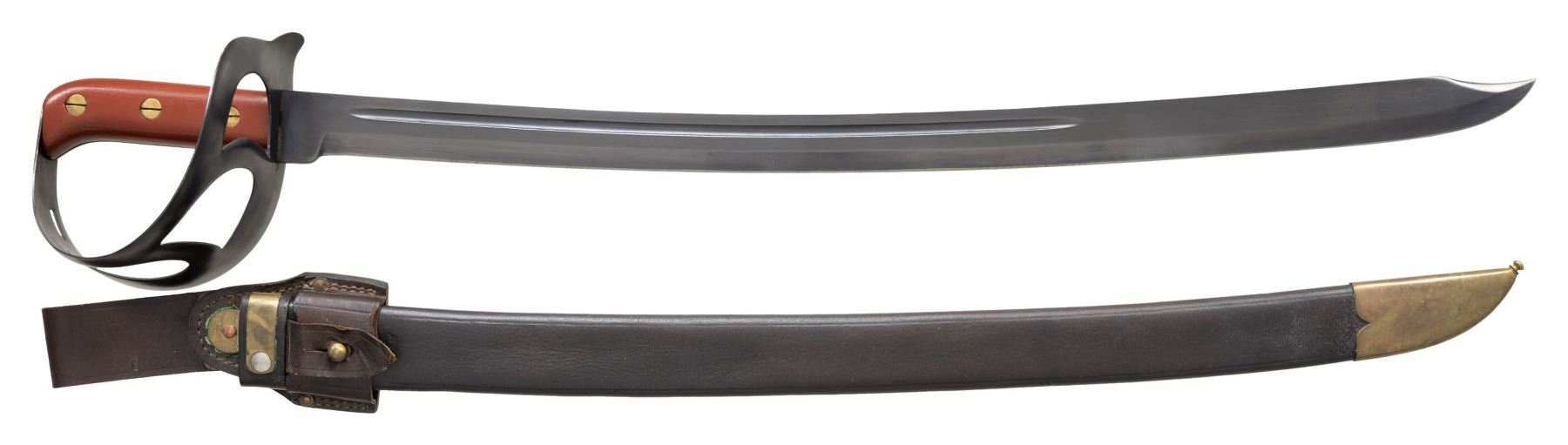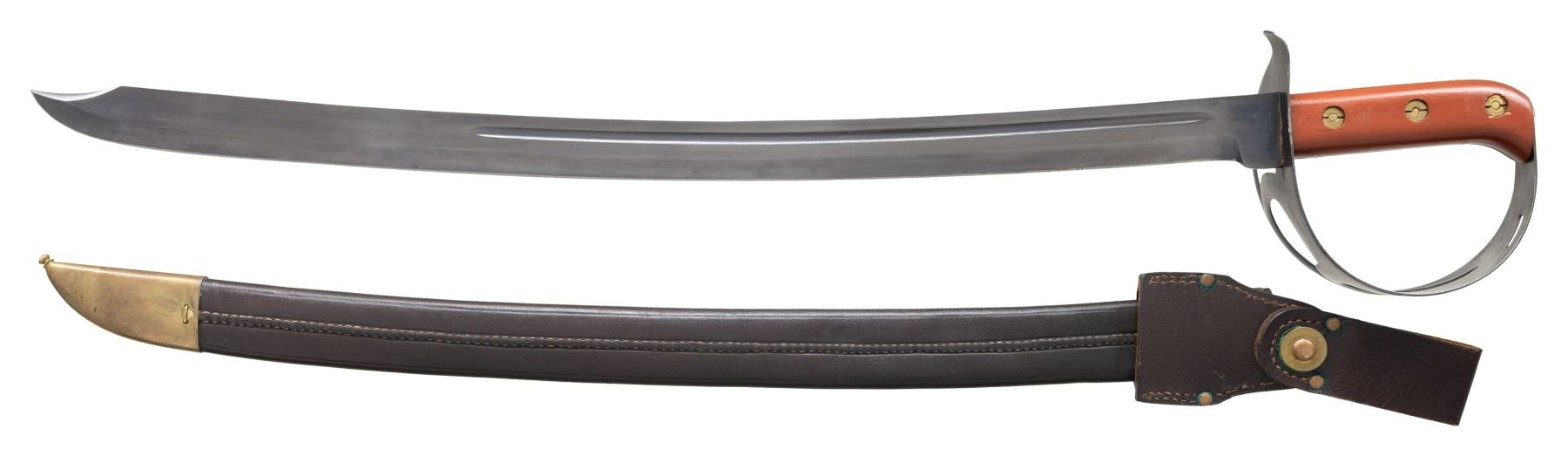 Reproduction U.S. M1941 Naval cutlass produced by an unknown mfg. Metal components are unmarked and unproofed. Steel clip point blade and guard exhibit a blue finish. 2-piece brown painted wood grip panels. UNATTACHED ACCESSORIES: brown leather scabbard with brass fittings. CONDITION: excellent, with the blade retaining a sharp edge. Grip panels are very good overall. Scabbard remains malleable, showing some verdigris on brass fittings. (02-25180/MLW). NON-GUN. $100-200.