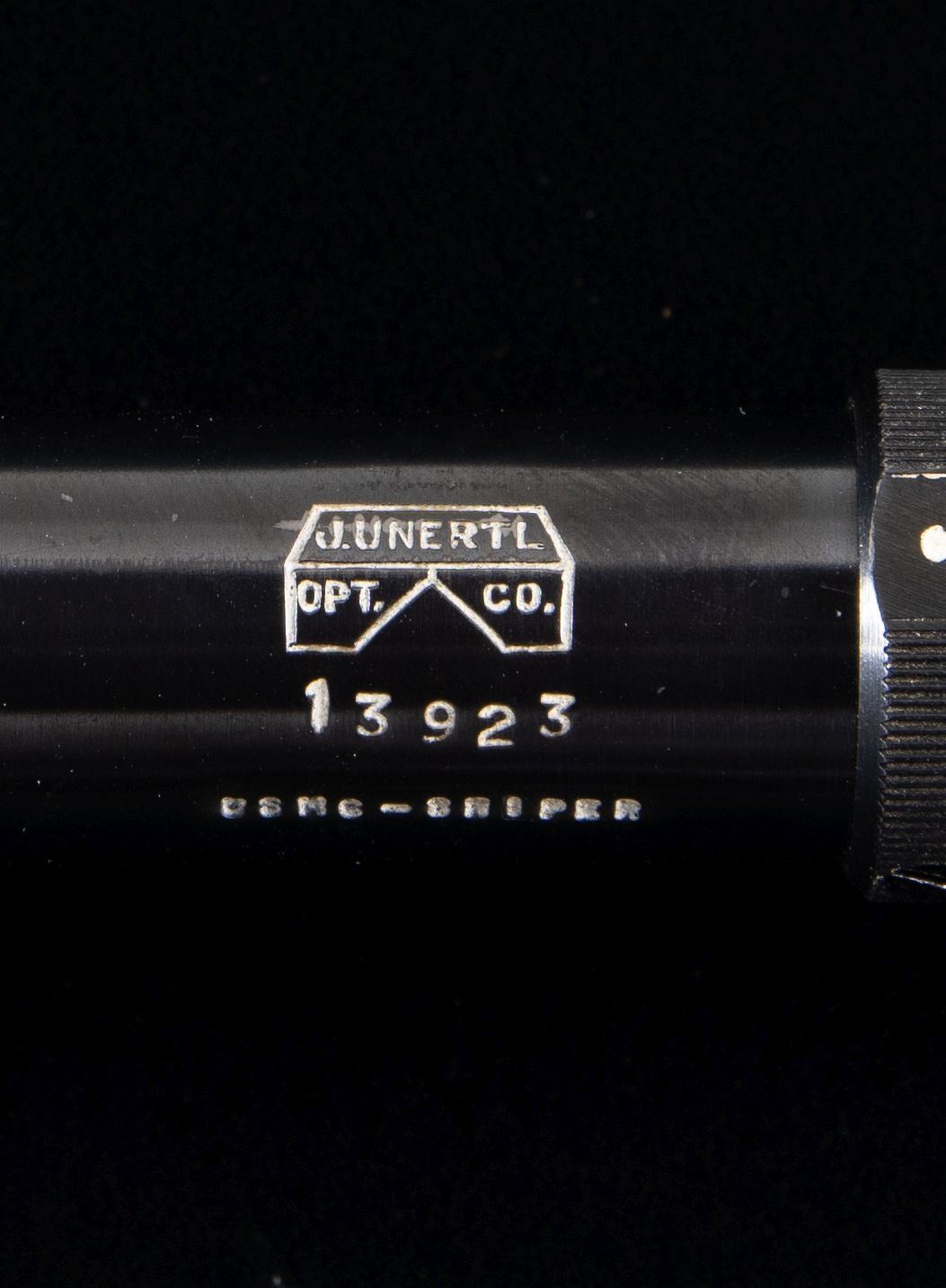MARKING. Scope measures 21 3/4" long. 3/4" blued steel tube. Scope is marked on top w/ the "J. UNERTL OPT CO" logo. Serial number reads as "13923". Scope marked on left side "USMC-SNIPER". Lock ring is marked on top "8". Fine crosshair reticle. Equipped w/ adjustable objective. Black finished cast aluminum mounts. Windage knob does not have the coin slotted screw. Scope does not have return spring, but retains the adjustable sliding stop. Ocular & objective bells are threaded for scope caps, which are not present. CONDITION: scope retains a large percentage of its blue finish w/ very light wear & scattered scratches. Markings enhanced w/ white. Scope mounts have flaking & wear of their black finish. Adjustment clicks appear positive. Optics are slightly cloudy, but serviceable. Reticle is slightly off-center to the right. (02-24537-1/RW). NON-GUN. $300-500.