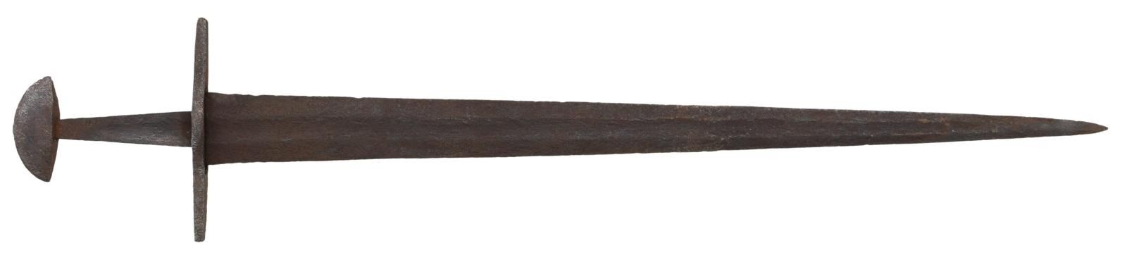 Overall length: 35". Blade length: 29". A very attractive copy of a Viking broadsword roughly of a style dating from 900 to 1100 AD. The sword appears to be blacksmith made with a dark brown, heavily oxidized finish. The sword gives the appearance of being excavated and has no grip or scabbard. CONDITION: sword is very solid and has an overall dark brown, oxidized finish. (02-19611-2/BF). $200-300.