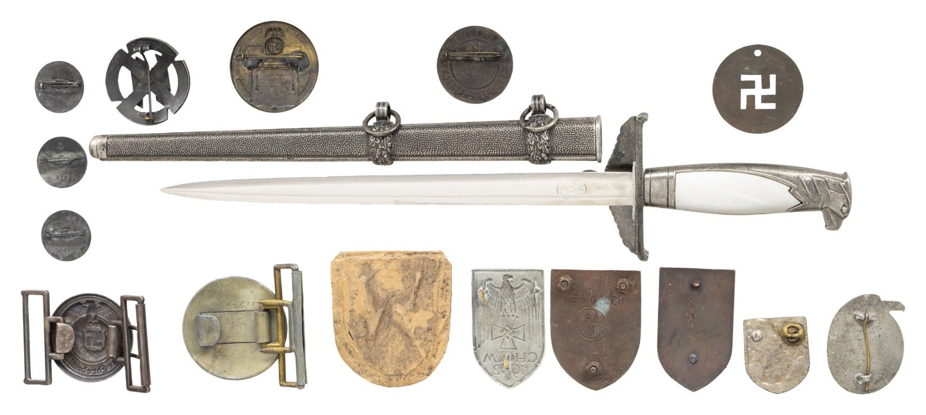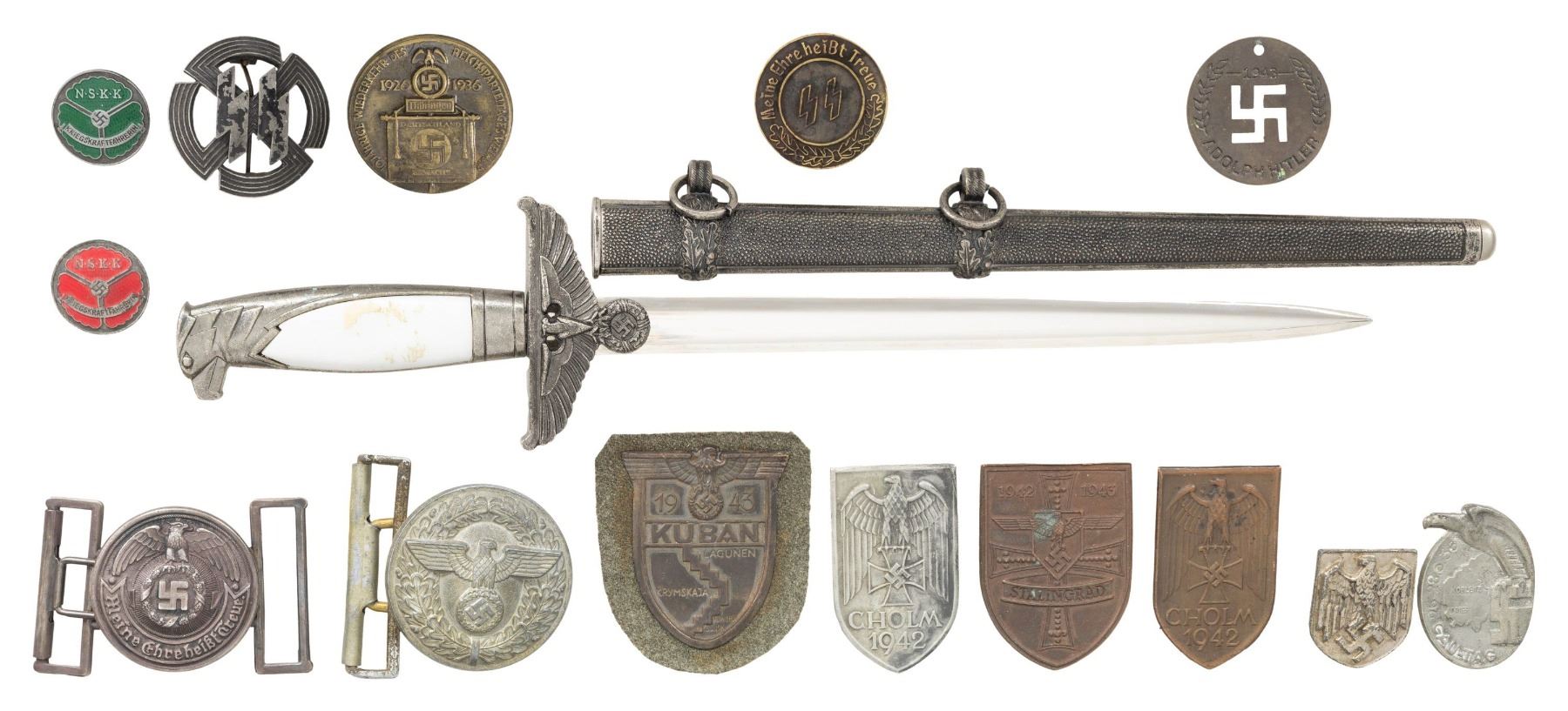 This varied lot of reproduction items consists of 1 SS officer's belt buckle with keeper. / 1 Adolf Hitler token 1943. / 1 Stalingrad shield. / 2 Cholm shields. / 1 Kuban shield with backing. / 1 SS Proficiency Badge. / 3 NSKK women's Driver badges in three different colors. Gau Tag badge 1936. / 1 SS tinnie. / 1 Eagle shield for a pith helmet. / 1 Political leader's belt buckle with no keeper. / 1 Brass tinnie from 1936. / 1 Diplomatic Service dagger with scabbard measuring 15 1/4" overall. CONDITION: all items show little wear unless artificially induced. (02-24077/BF). NON-GUN. $100-300.