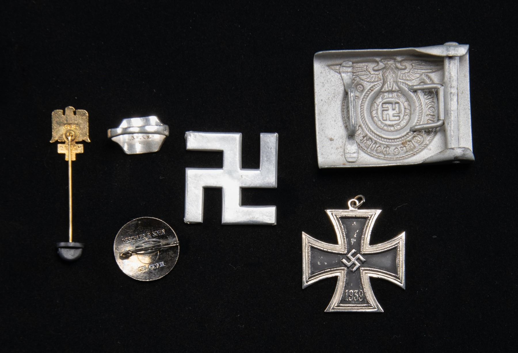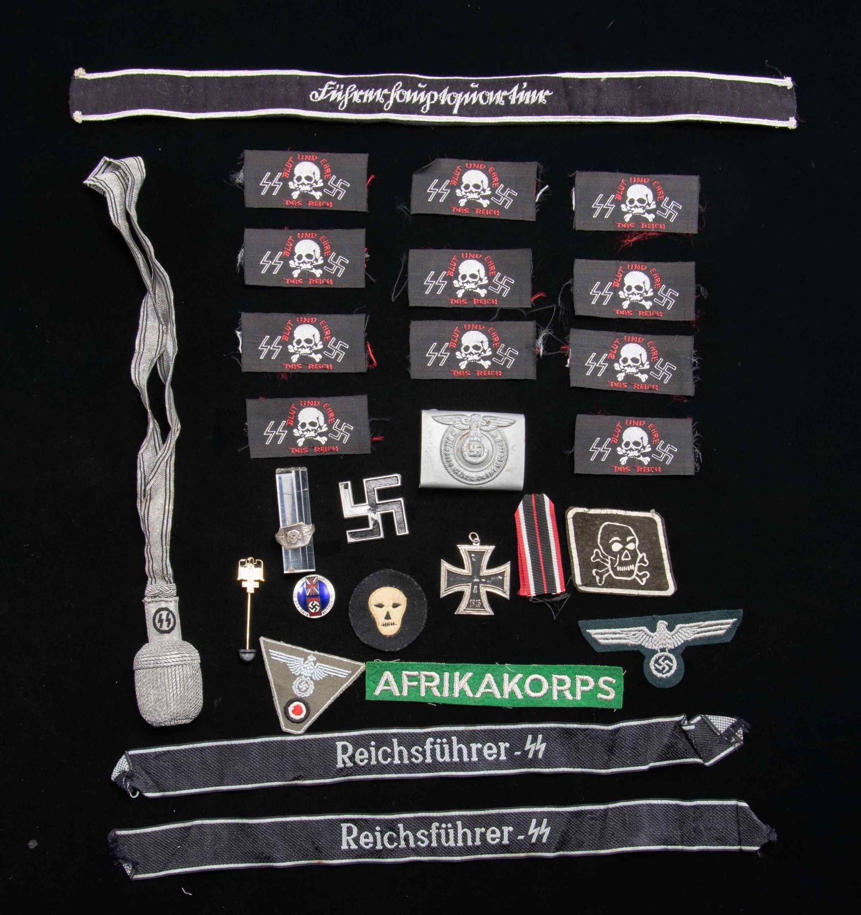 This lot contains items we feel are of post WWII manufacture. The lot includes 1 SS belt buckle. / 4 Cuff titles. / 1 Collar tab. / 1 Army Panzer breast eagle. / 1 TENO M43 type cap eagle. / 1 Party symbol. / 1 WWII 2nd Class Iron Cross no ribbon. / 1 SS sword knot. / 11 Fantasy SS patches. / 1 Black and white specialty patch with a central skull. / 1 Red Cross stickpin. / 1 British and German friendship enamel pin. / 1 Silver death's head ring. CONDITION: most items show light wear. (02-24137-2/BF). NON-GUN. $150-300.