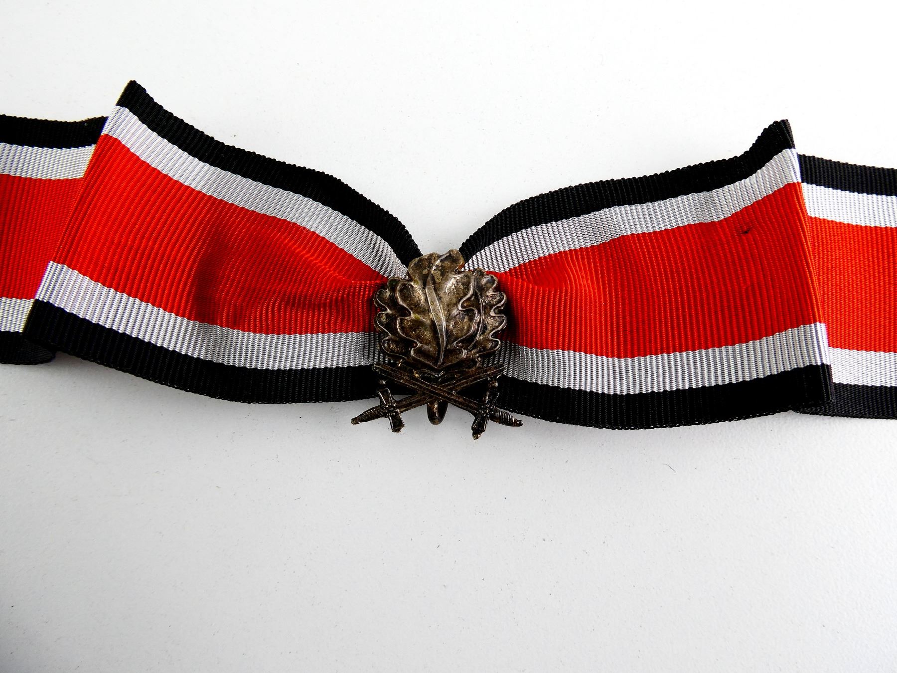 (1) REPRODUCTION KNIGHT'S CROSS OF THE IRON CROSS RIBBON WITH OAK LEAVES AND SWORDS CLASP, BACK OF CLASP MARKED: "800", NON-MAGNETIC, RIBBON GLOWS UNDER BLACK LIGHT. SEE PHOTOS.