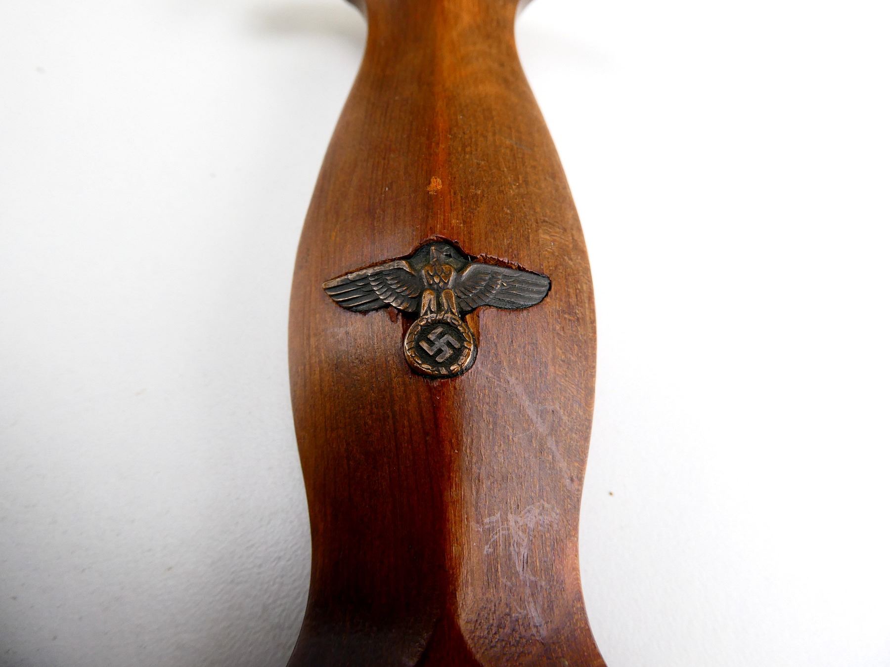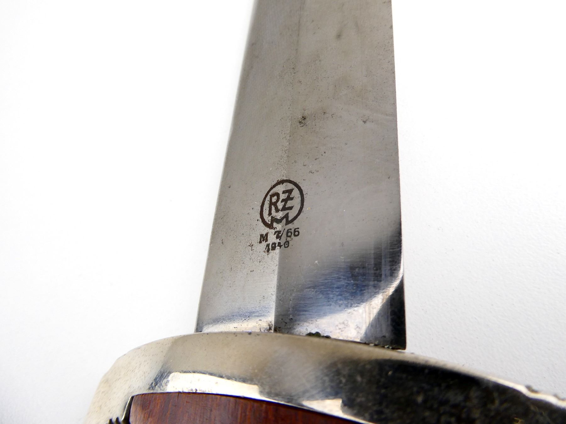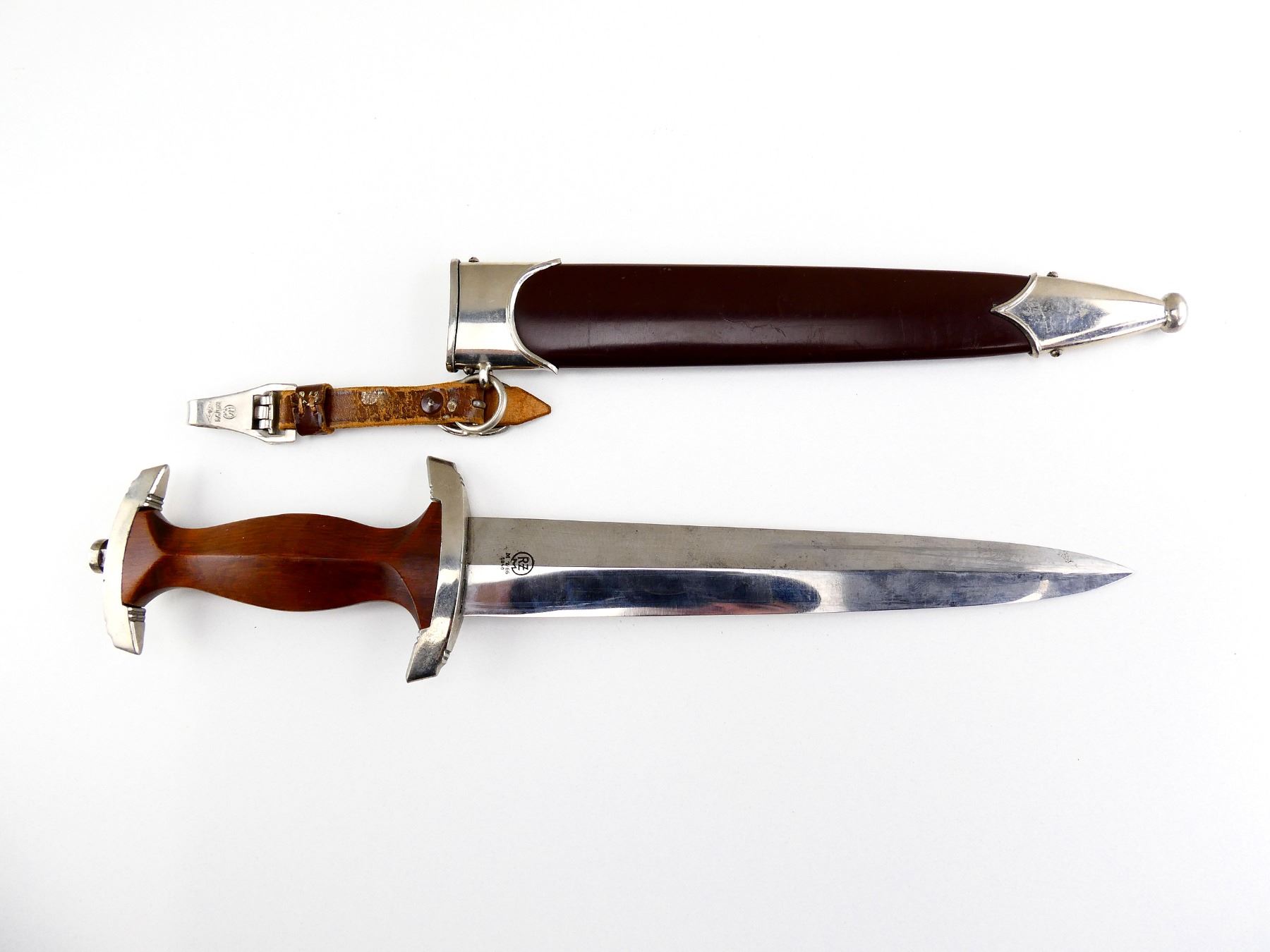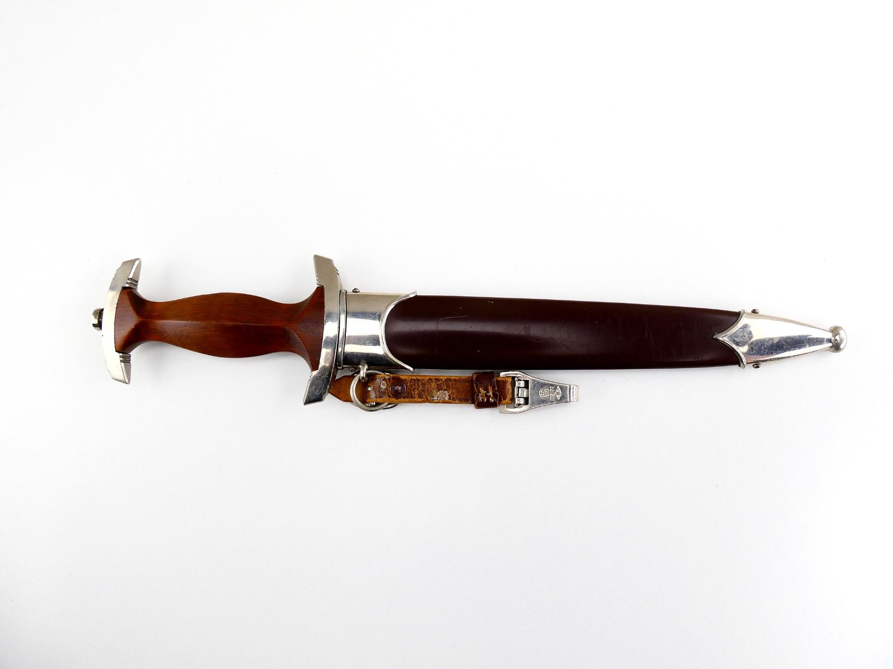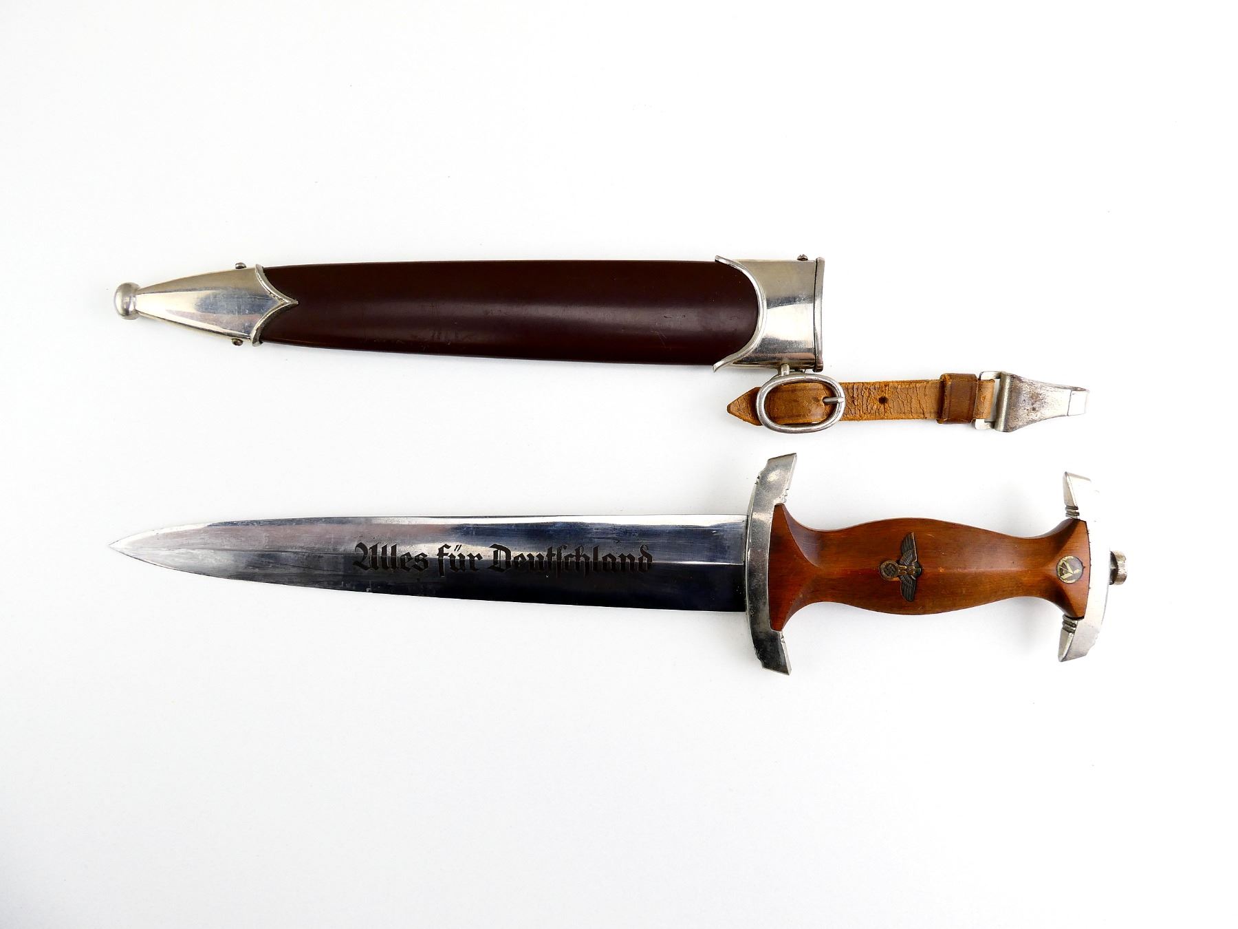 (1) REPRODUCTION NSKK DAGGER, DOUBLE-EDGED BLADE, RICASSO MARKED: "RZM, M7/66, 1940", OTHER-SIDE MARKED: "ALLES FUR DEUTSCHLAND", 1-PIECE WOODEN GRIP WITH COPPER FLYING EAGLE HOLDING SWASTIKA BADGE & "SA" INSIGNIA, METAL POMMEL, NO VISIBLE MARKINGS, POMMEL / STUD ON POMMEL IS LOOSE / MOVES, BROWN PAINTED METAL SCABBARD WITH ONE HANGER LOOP & LEATHER TAB WITH HOOK, HOOK MARKED: "RZM, M5/71" & "OLC" IN A DIAMOND SHAPE, BLADE APPROX. 8.75" & OAL APPROX. 13.75". SEE PHOTOS.