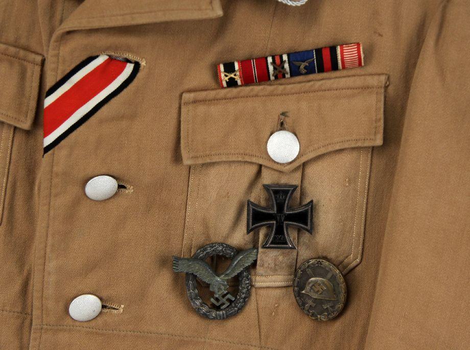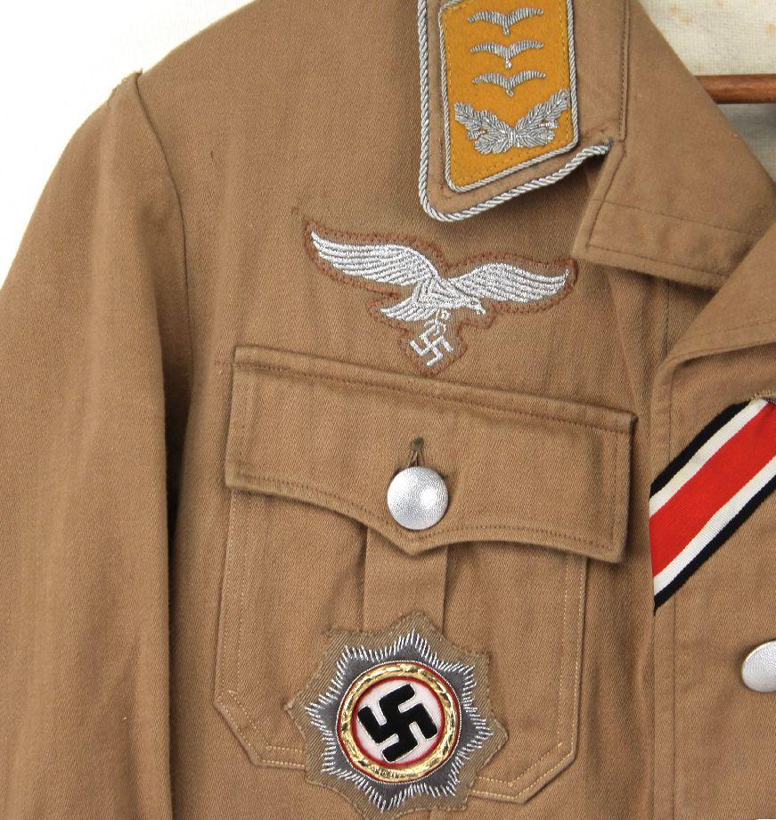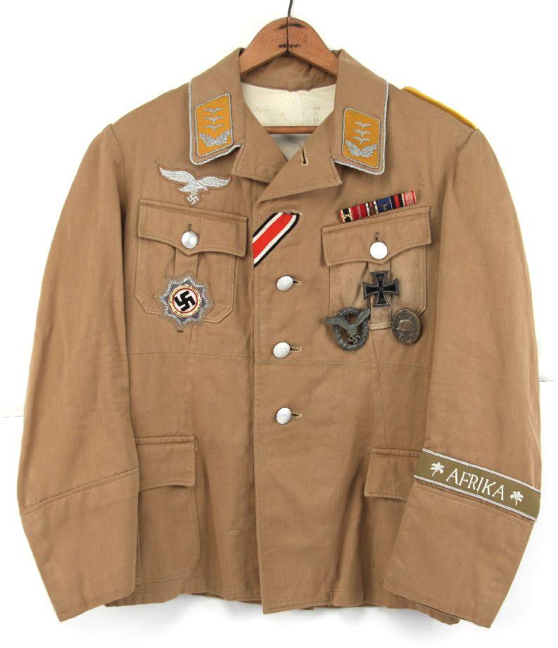 Reproduction WWII German Luftwaffe Afrika Corps tunic. Cloth German Cross, shoulder boards, breast eagle, and cuff title are reproduction. Tunic is likely post war. Collar tabs appear right, badges are questionable. Tunic is in good condition. Good display or re-enactment piece.