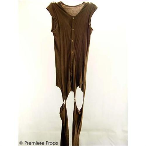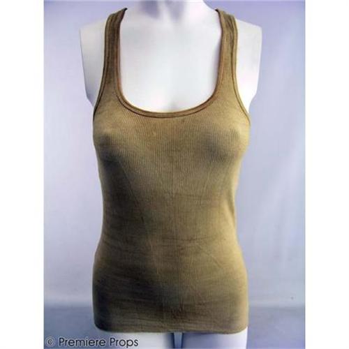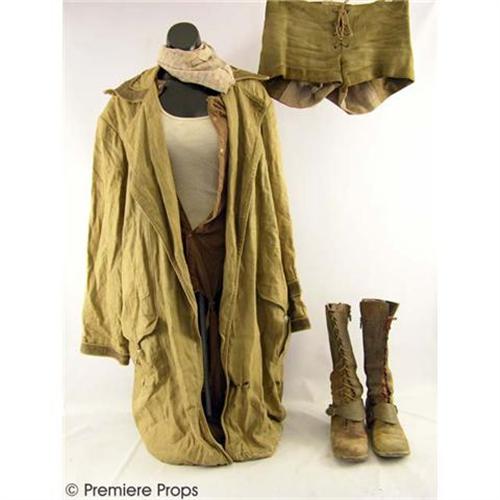 RESIDENT EVIL EXTINCTION - Alice's (Milla Jovovich) screenworn complete hero costume. This outfit includes a soiled white "American Eagle" tank top, a brown snap up short sleeve shirt with matching attached leggings, a tan two pocket coat, tan leather-like shorts that lace and tie in the front and to complete the costume are a pair of brown leather lace and zip boots. The left boot has red laces. All articles are distressed / aged / soiled from use during filming. This outfit can be seen worn throughout the movie. Your chance to add a valuable screenworn costume to your memorabilia collection!! PLEASE BE AWARE THIS ITEM DOES NOT INCLUDE THE FLORAL PRINT SCARF AS SEEN IN THE PHOTO. (REE1010)