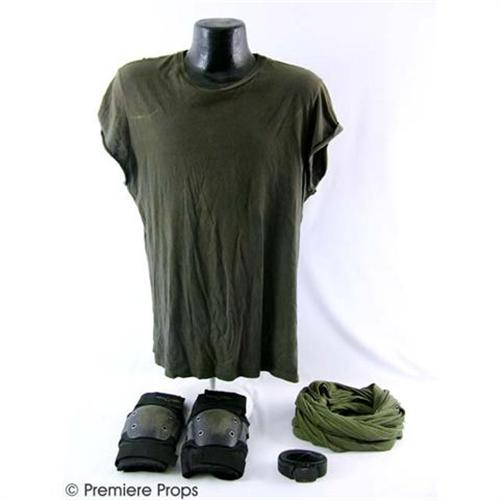 RESIDENT EVIL EXTINCTION - Prepare yourself for battle with Carlos' (Oded Fehr) screenworn military-themed gear. The collection includes a dark green "James Perse" S/S t-shirt (tagged "Carlos" with black marker on the inside), a dark green tattered scarf, black and grey "Pro Tec" elbow pads, and a black-cloth military-style belt. Don't miss this opportunity to own an integral costume from the set of RESIDENT EVIL EXTINCTION.(REE1065)