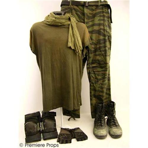 RESIDENT EVIL EXTINCTION - Thwart the zombie hordes in Carlos Olivera's (Oded Fehr) Eastern Costume. The screenworn outfit comes complete with everything you would need to battle the evil Umbrella Corporation, including a dark green "James Perse" S/S t-shirt with the name "Carlos" written on the inside with black marker, green/brown/black cargo camouflage pants, a dark green tattered scarf, black and grey "Fox" gloves, black and grey "Pro Tec" elbow pads, a black military-style belt and black "Bates" lace/zip combat boots. All items are deliberately aged and soiled to lend the costume a very authentic quality. A wardobe tag is included. This costume could be a worthy compliment to any memoribilia collection. (REE1003)