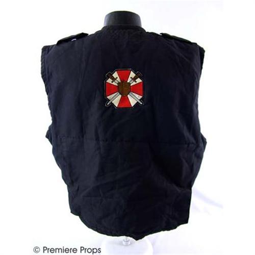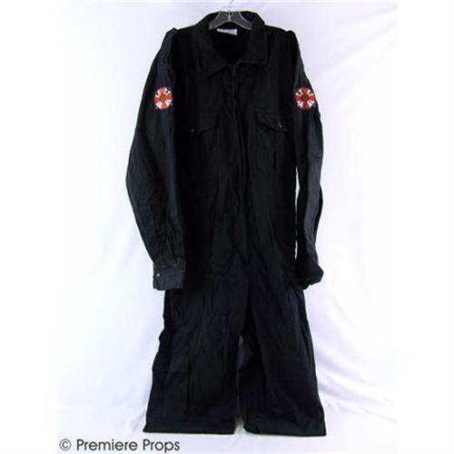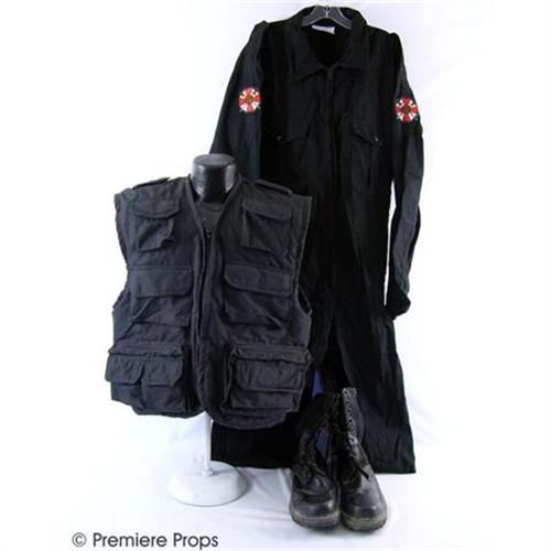 RESIDENT EVIL EXTINCTION - From the fine folks who brought you the T-Virus, this is Umbrella Tech's black "El Equipo Militar" costume. The screenworn ensemble includes a multi-pocket vest with the Umbrella logo on back (Inside reads "Umbrella Tech"), along with a black "El Equipo Militar" coveralls/jumpsuit accented with Umbrella logos on each shoulder (size 44), and black lace-up combat boots with side zippers. Avoid extinction with this amazing costume from the set of RESIDENT EVIL EXTINCTION. (REE1056)