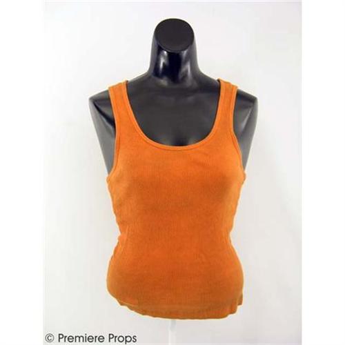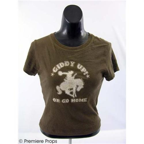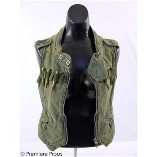 RESIDENT EVIL EXTINCTION - Face the zombie masses head-on with K-Mart's (SPENCER LOCKE) sassy and screenworn costume. The outfit includes a fierce-looking faded olive green "Diesel" zip vest adorned with high-cliber spare bullets, a brown "G. Girl" t-shirt emblazoned with the phrase, "Giddy Up or Go Home" and an olive green skirt featuring a colorful embroidered eagle and an orange "Lola" tank top. Written inside of the skirt with marker is the name "K-Mart. Complimenting the garments is a brown leather holster, an olive green patchwork hat by "Triple Five Soul", and "Willson" safety-spectacle sunglasses with side protection. Also included is a lone earring featuring the Eiffel Tower and a number of beads, a brown and red beaded necklace with an oval shaped metal charm, five faux-leather wrist bands, and one brown stitched leather collar. Wardrobe tag is included. Don't miss this opportunity to own an immaculate costume from RESIDENT EVIL EXTINCTION. (REE1026)