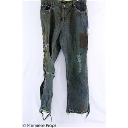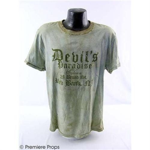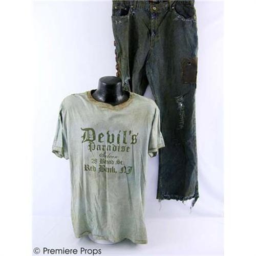 RESIDENT EVIL: EXTINCTION - This is Runty's (Ramón Franco) screenworn costume. It includes a greenish-gray "Aeropostale" t-shirt (size XL) adorned with the name and address of the "Devil's Paradise" saloon (inside the collar reads "Runty"), and a pair of blue demin "Nonstop" jeans (size 36) with leather patching and a bottle cap strip down the right leg (inside waist reads "Runty"). All articles are distressed and soiled to produce a very authenctic appearance. Don't miss your opportunity to own a costume taken from the set of RESIDENT EVIL EXTINCTION. (REE1080)