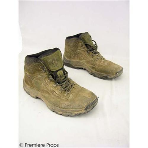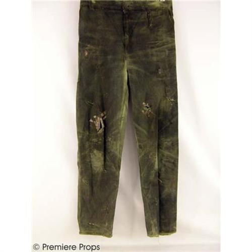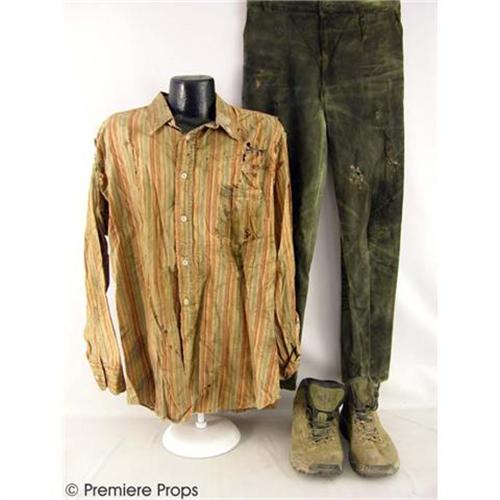 RESIDENT EVIL EXTINCTION - The latest in undead fashion, this is a screeworn zombie costume that includes an orange/brown/off-white/light blue "Aeropostale" L/S button-up shirt (size XL), black pants and a pair of light brown hiking boots (size 10.5). All items are extremely tattered and the shirt and pants are accented with small bloodstains. Costume includes wardrobe tag. Impress your neighbors with a costume taken from the set of RESIDENT EVIL EXTINCTION. (REE1012)