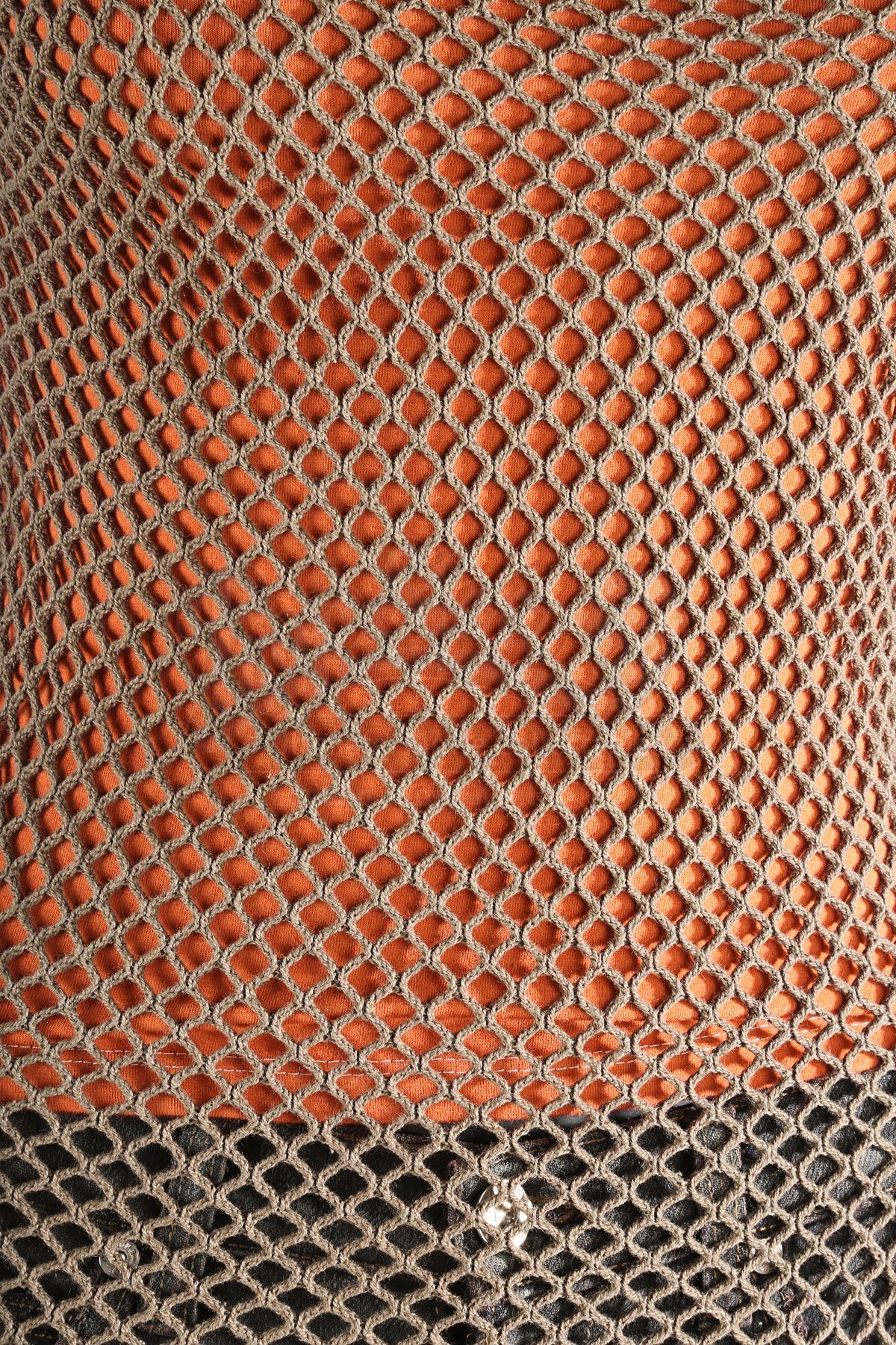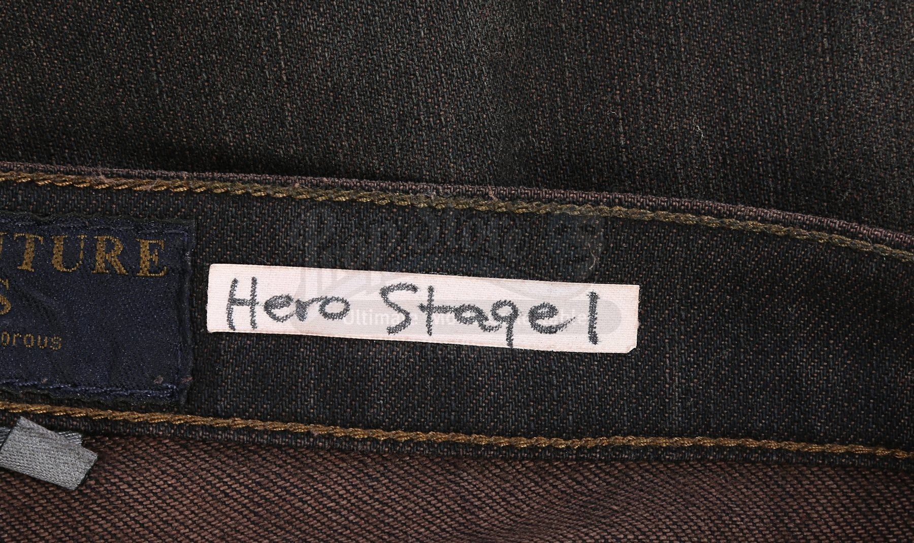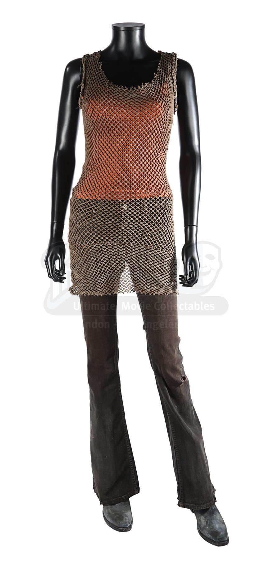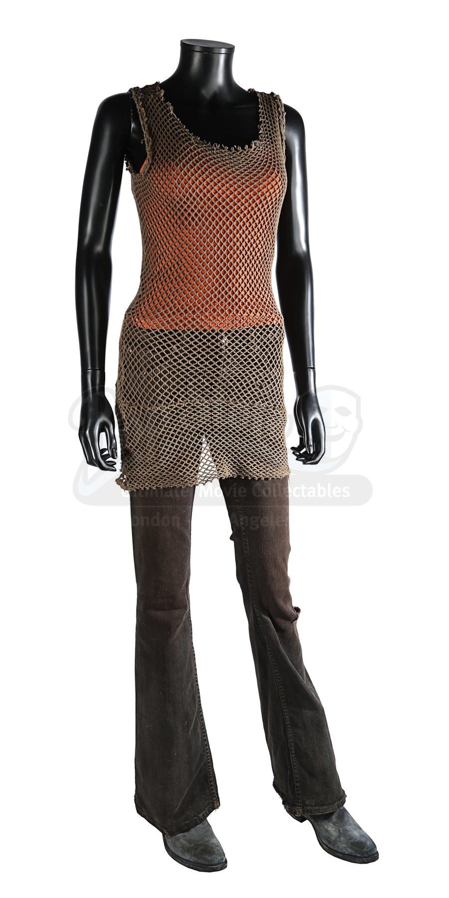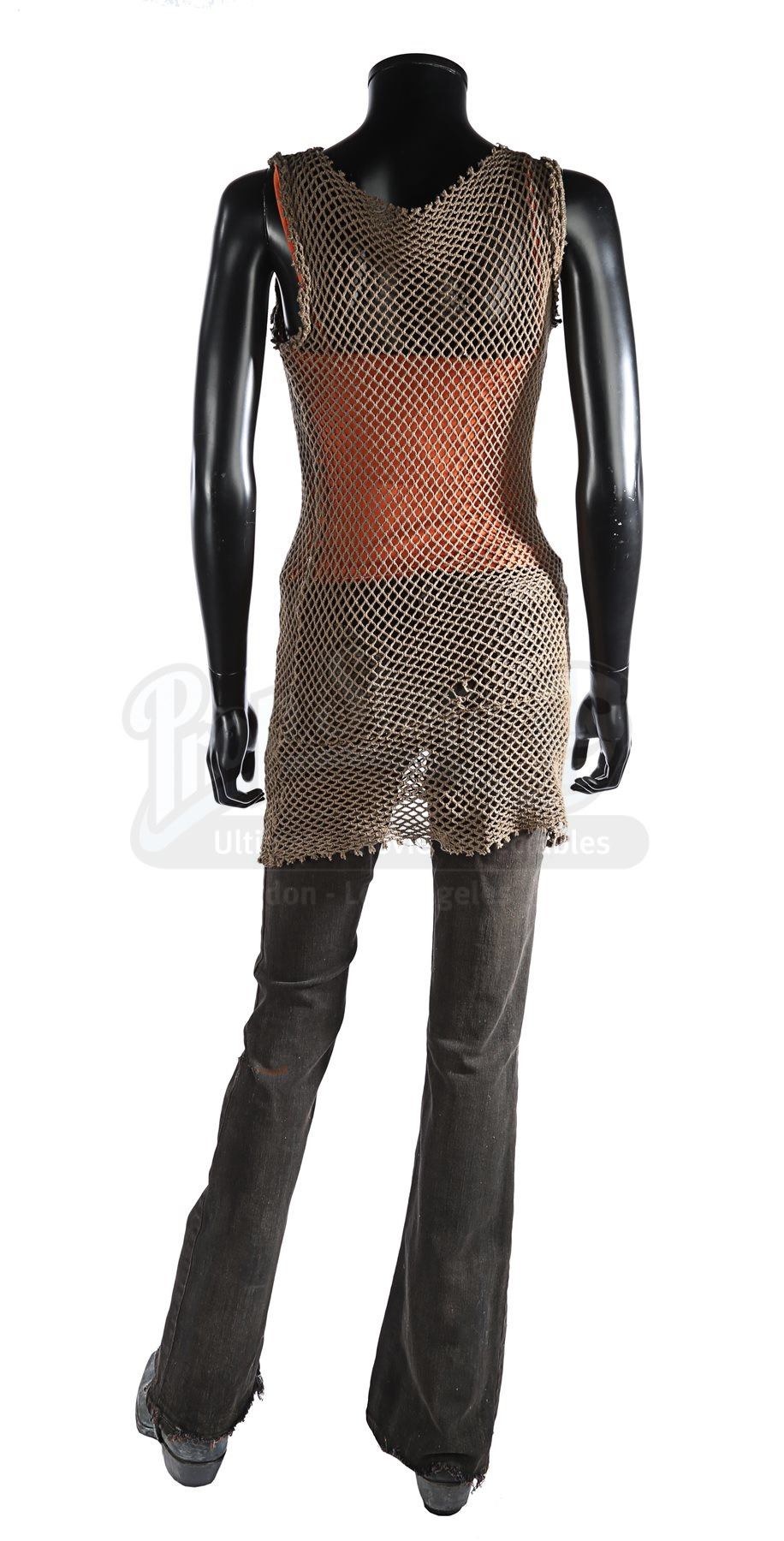 The costume consists of a khaki fishnet vest, an orange camisole vest (marked size small), a pair of black flared jeans and a pair of distressed black boots with buckle detailing. A label with the text “Hero Stage 1” handwritten in black is adhered to the inside of the jeans, and strips of white tape with “Alice 2nd” are stuck to the interior of the boots. There is a small rip on the front of the jeans, and some garments show minor wear from use on production.