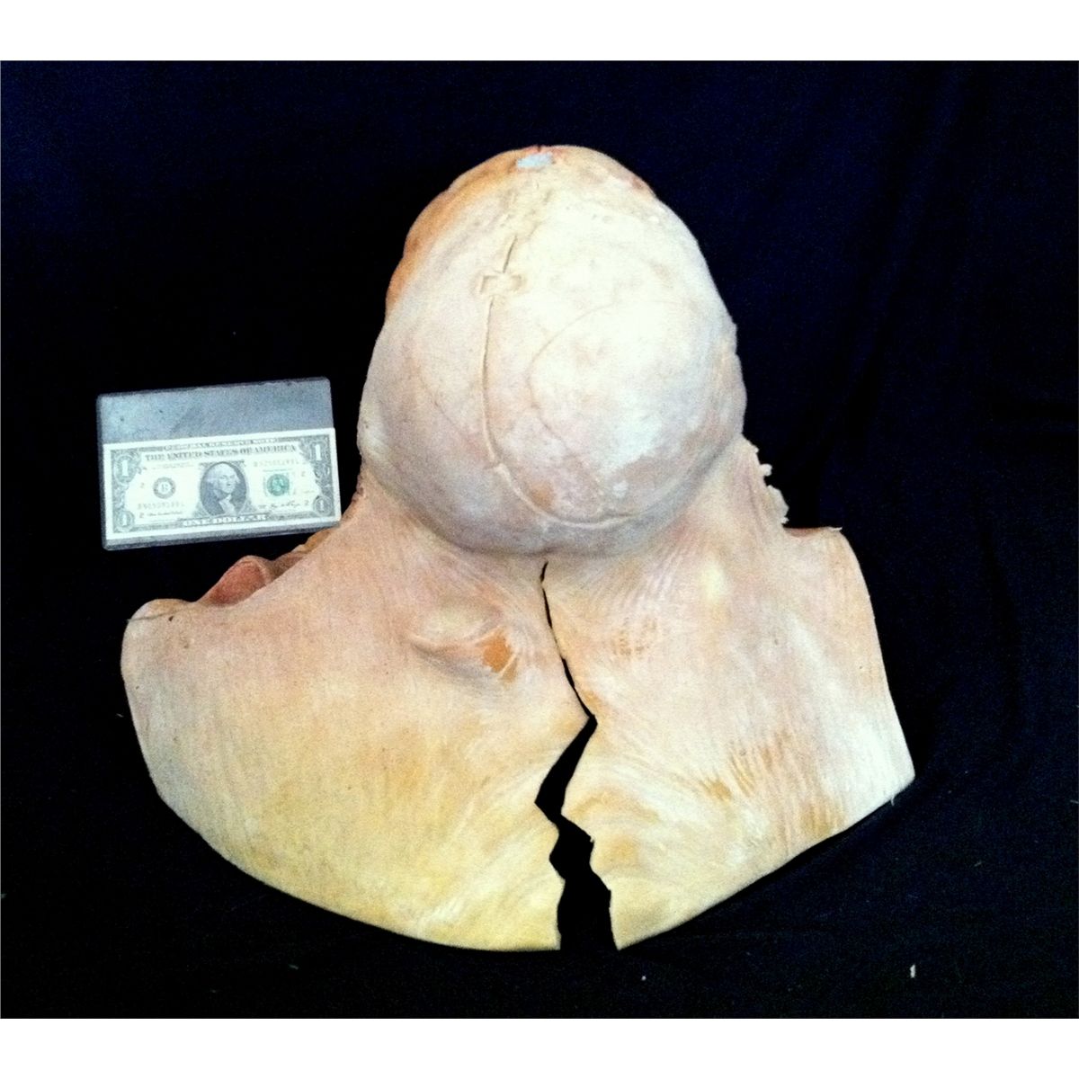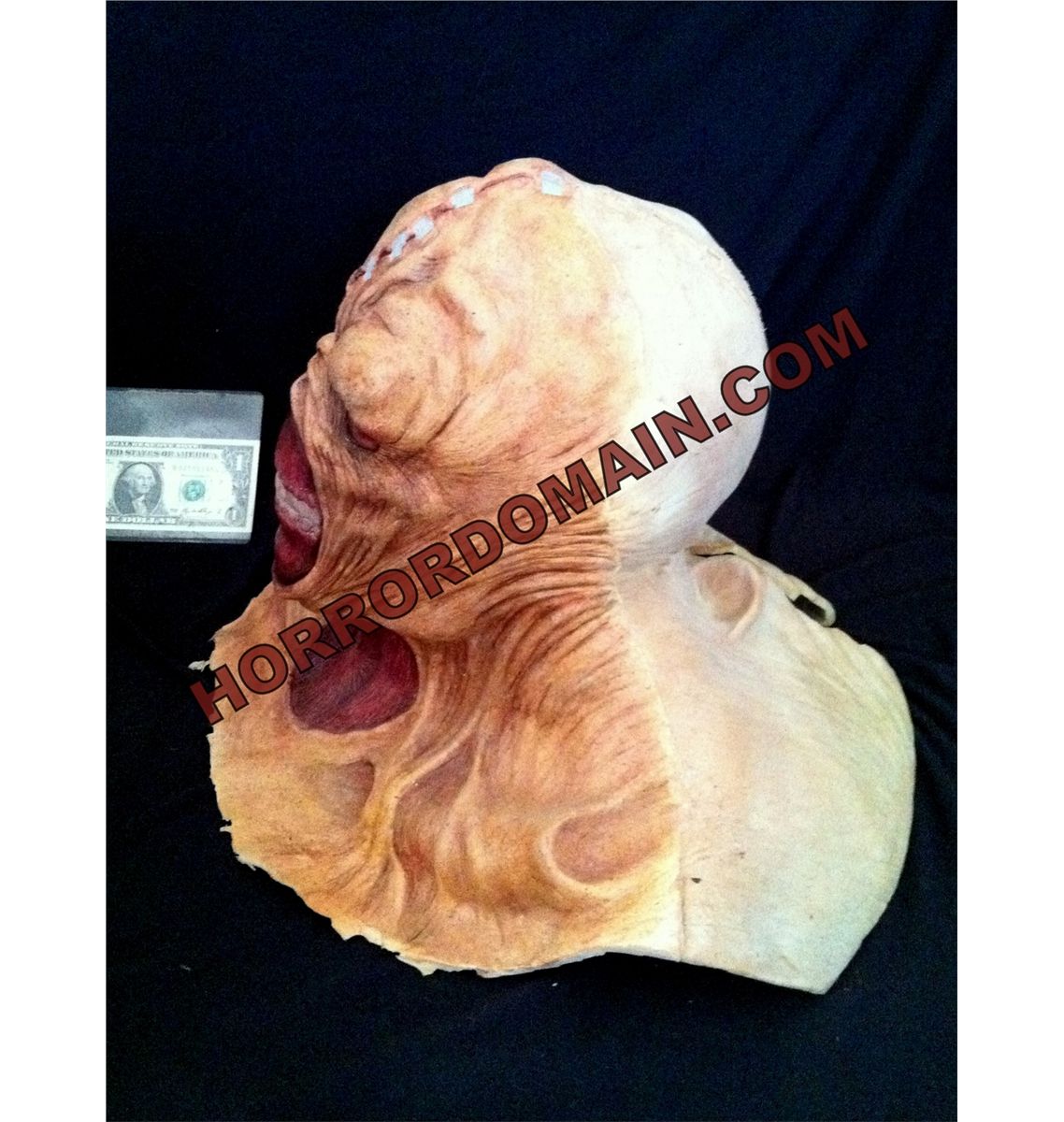 It is a heavy latex slush pull. Oddly cut around the bust area, and only painted in front. The red eye is taped in from the inside. It is split in the rear, but with the eye in place you would have cut it for visibility.