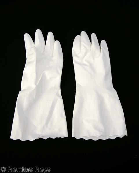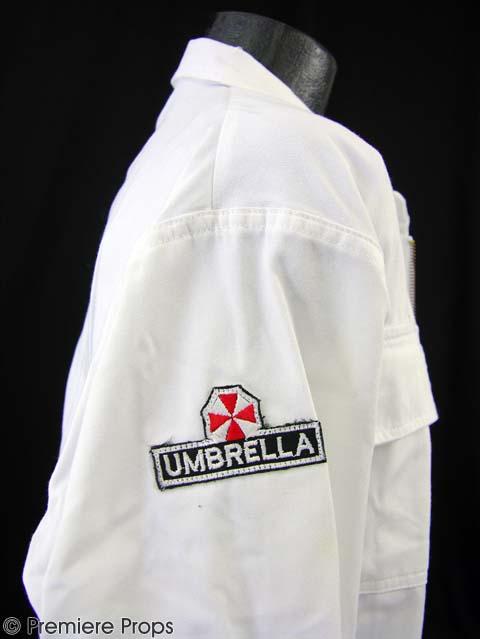 Dr. Isaac's screen worn jumpsuit lab coat with Umbrella patches on each shoulder (size 42). This coat has 6 pockets and zips open on the front. The inside reads "Lab Tech". Also included is a pair of white rubber gloves (size L 8.5-9).