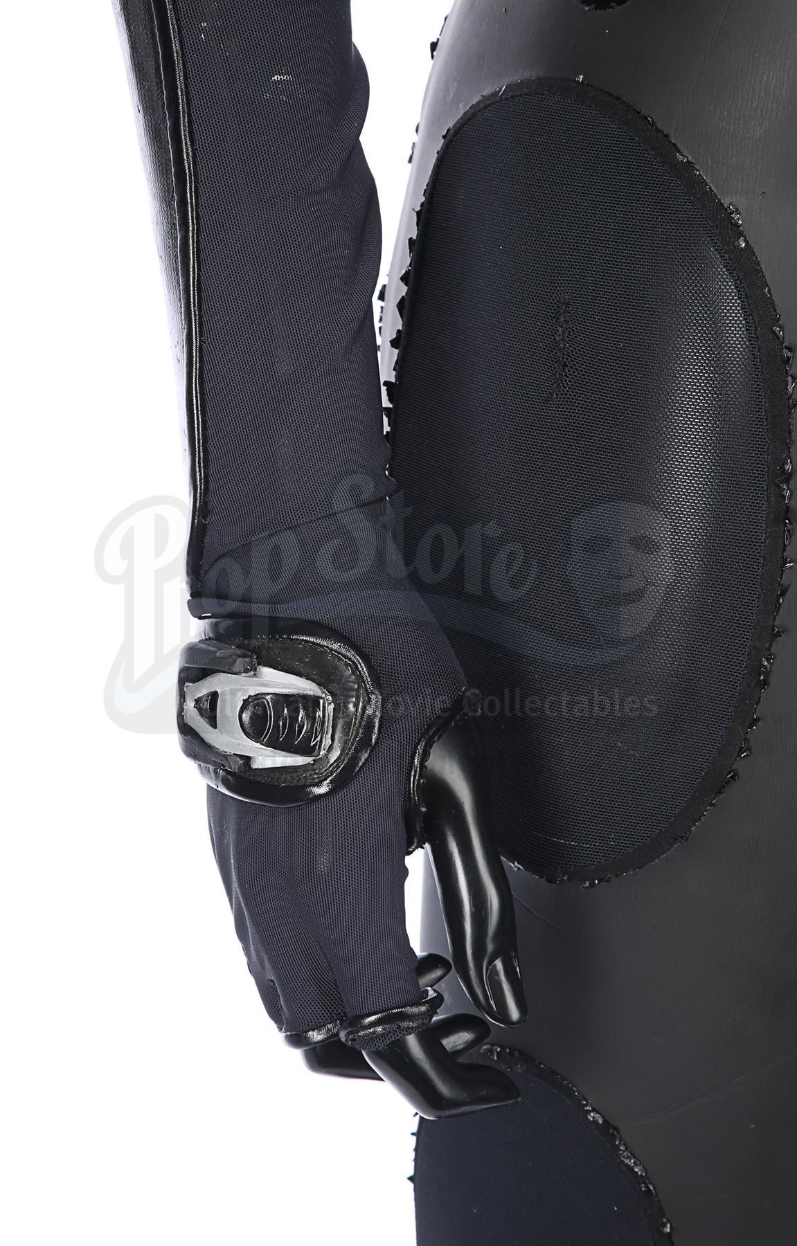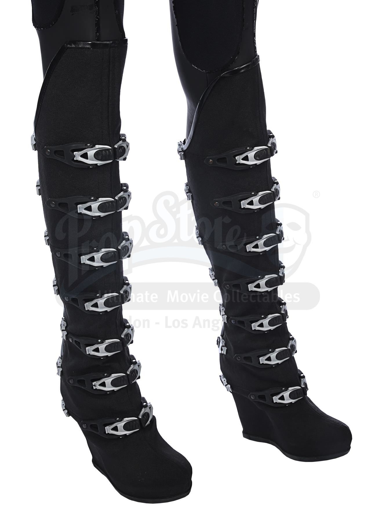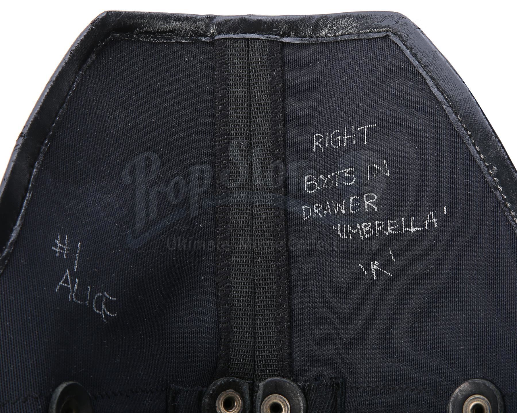 The jumpsuit is made of a flexible, elasticated mesh, with rubber sections designed to imitate leather. In the centre of the chest is an Umbrella device, made of resin. The corset is made of an elasticated material, and features a hidden zip on the front-left side and resin clasps painted to look like metal. Magnets are hidden in the back of the corset; these line up to where Alice carried her guns. The boots feature metal clasps and zips up the back. The arm cuffs are designed to go on the bicep and are also elasticated with rubber clasps. The costume has some wear from production use and age, including some scuffing and scratches. Some of the rubber piping on the jumpsuit has flaked away.