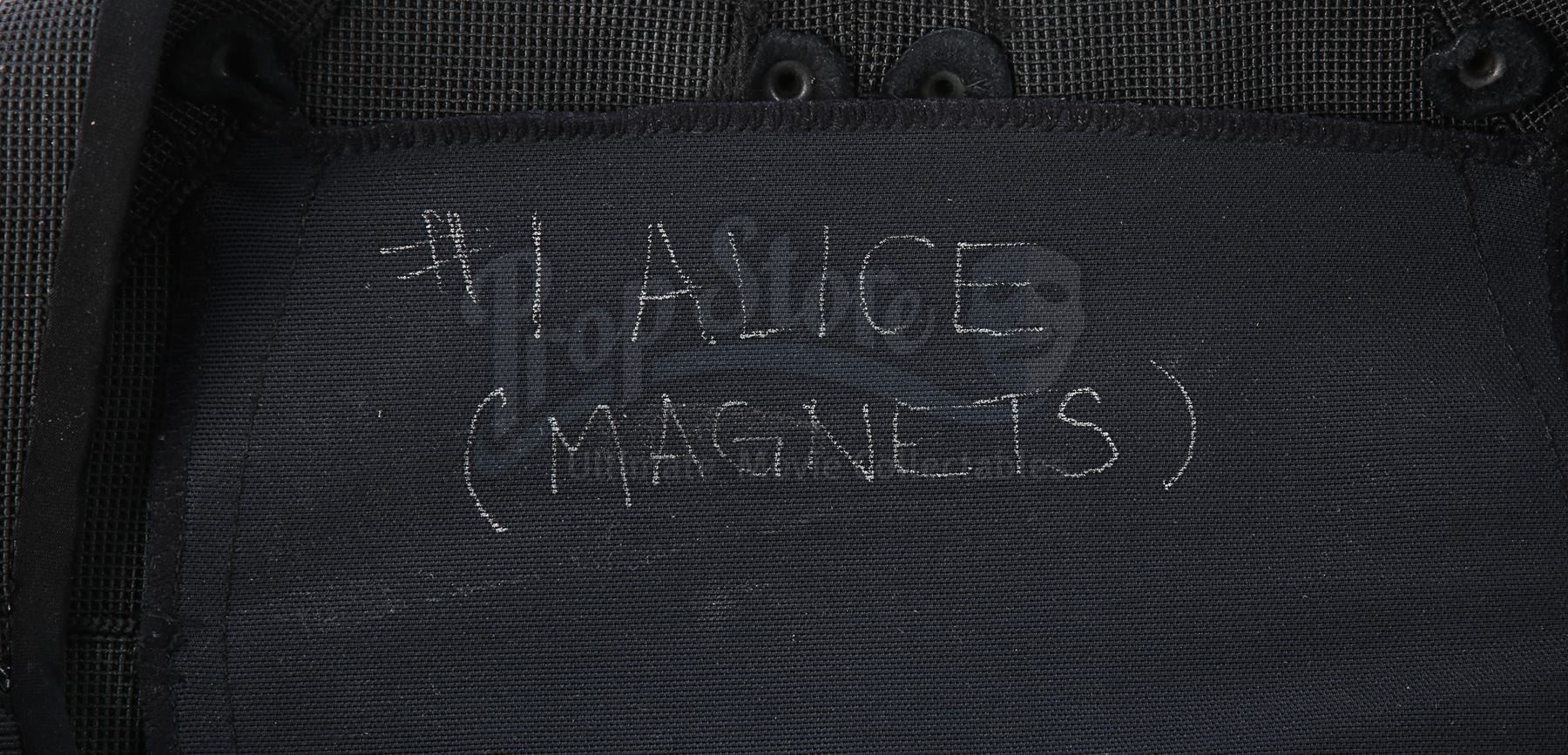 The costume consists of a jumpsuit; a corset, marked "#1 Alice Magnets"; a pair of knee-high boots, marked "#1 Alice Left Boots in Drawer €˜Umbrella'" and "#1 Alice Right Boots in Drawer €˜Umbrella' €˜R'"; and two arm cuffs.