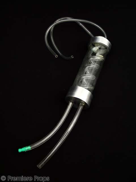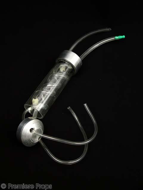 This is a Umbrella T-Virus Vial with Filling Hoses. The vial is constructed of glass and metal with rubber hoses attached at each end to fill the inner glass tubes. The end caps do not match and one side does not stay set on the vial. It measures 5" x 1.5".