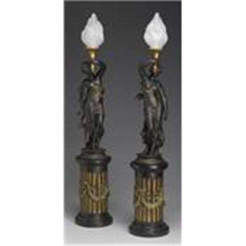 Bronze painted resin with antique gold painted accents. Flame shaped frosted globe. Each one uses one chandelier bulb and each has a toggle switch on the cord. Dimensions: Top:29"h, 6.5"w, 7"d; Base:14"h, 8"diam