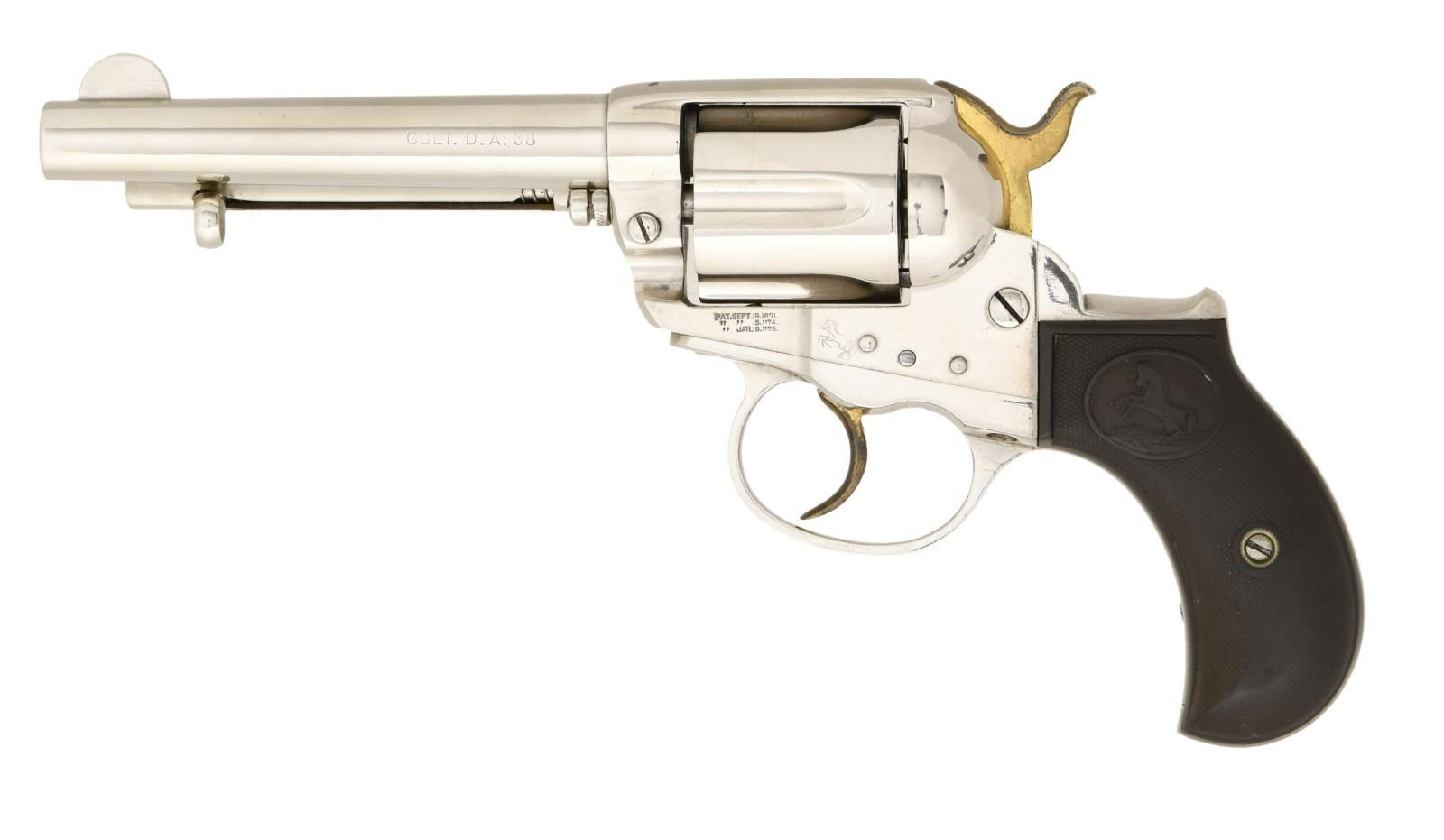 Cal. 38 Colt. S# 109046. Bbl 4 1/2". Model 1877 "Lightning" manufactured by Colt in 1898. The left side of the barrel stamped "COLT. D.A. 38", with Colt's 2 line address across the top. Left side of frame bears patent information followed by the Rampant Colt logo. Major metal components exhibit a reapplied nickel finish with the hammer and trigger having been refinished in a brass plating. Frame is mounted with 2 piece Colt checkered hard rubber grips. Matching numbers are present on the frame, cylinder, trigger guard, as well as on the butt. CONDITION: major metal components retain bountiful amounts of their reapplied nickel finish exhibiting some mild superficial handling marks as well as scattered areas of pitting present beneath the finish. Brass plated components show some wear and darker patina, with matching spots of pitting beneath the finish. Bore is bright as refinished, exhibiting scattered spots of pitting and good rifling throughout. Grips show heavy smoothing and some scattered marks from handling and storage, but are otherwise sturdy and serviceable. (01-23950/MLW). ANTIQUE. $400-600.